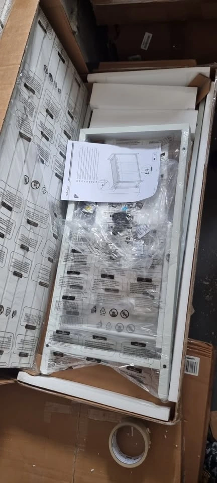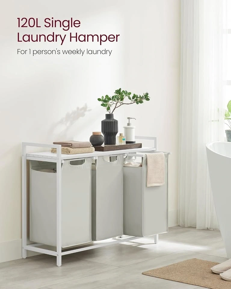 Laundry hamper with a metal frame and 3 pull-out, removable bags. Includes a shelf. Cream white and cloud white. Dimensions: 36.4 x 13 x 28.4 inches. Each bag is approximately 10.6 gallons (40 L).