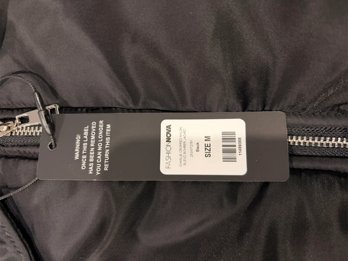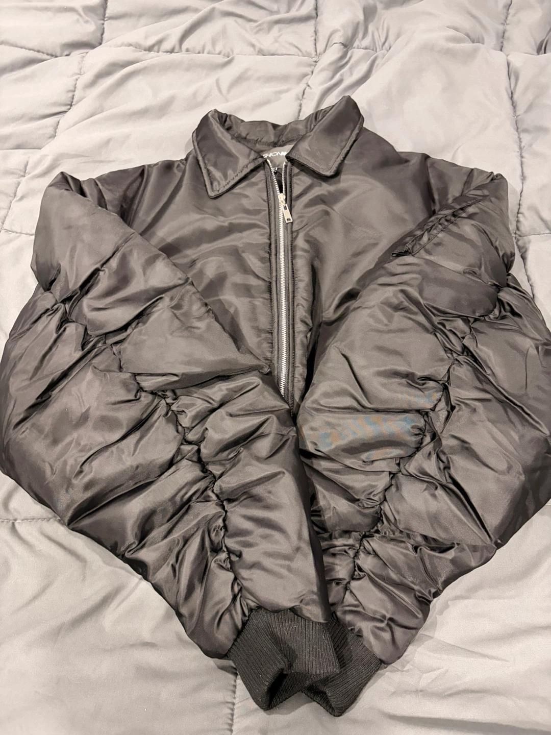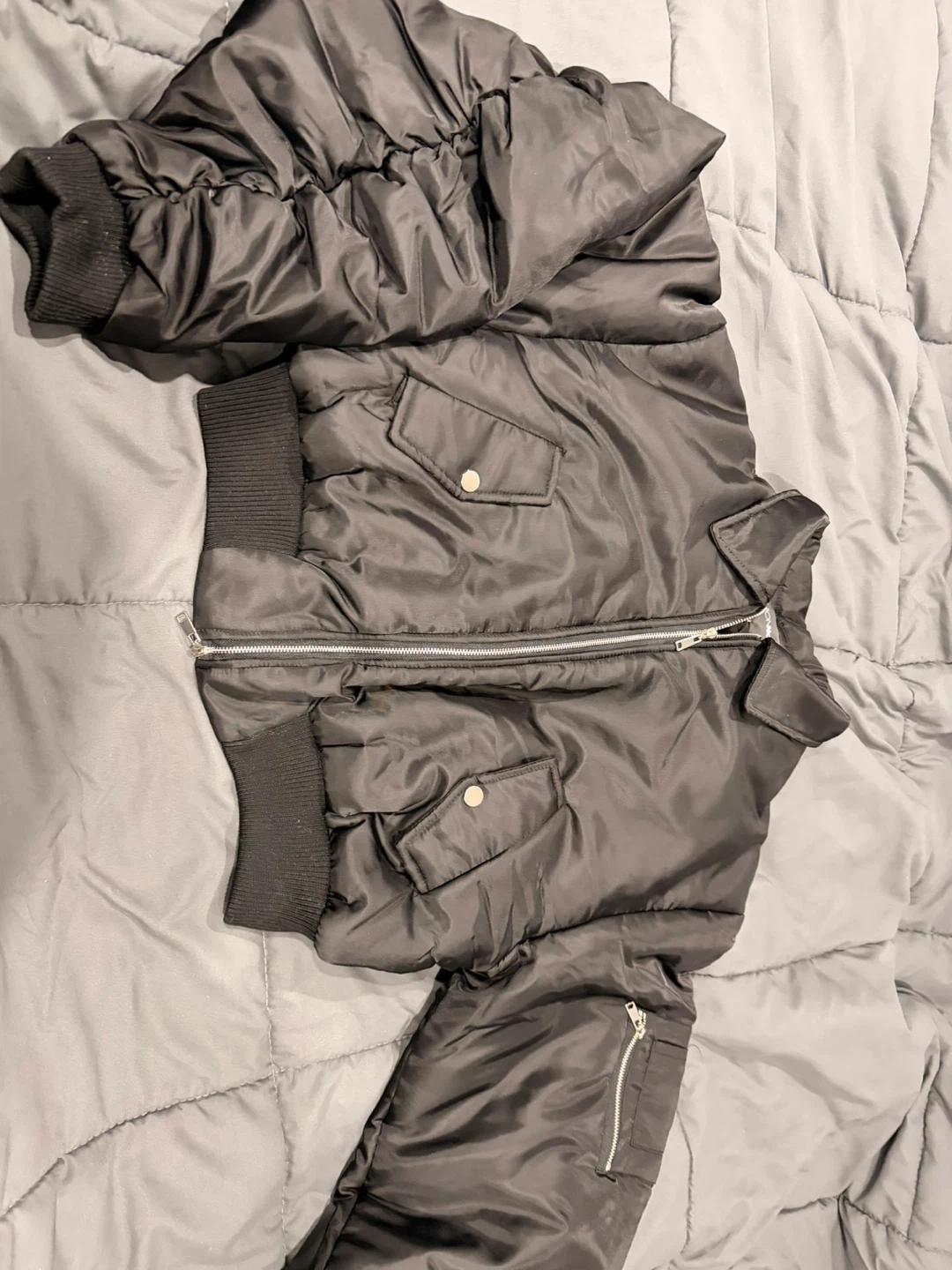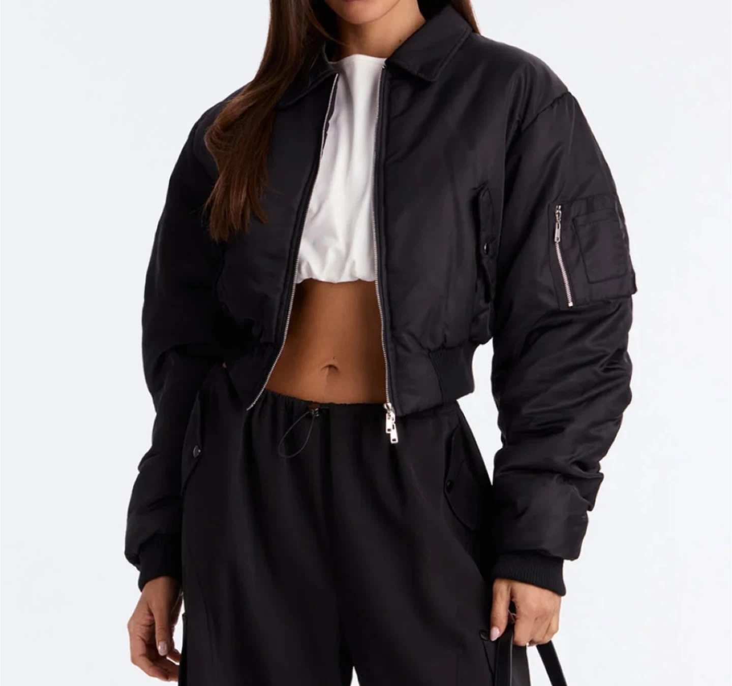This black cropped bomber jacket features a classic collar and a zip-up front. It's made of a shiny nylon-like material with elasticated cuffs and hem. The sleeves have a unique ruched design, and there are two buttoned flap pockets on the front, plus a zippered pocket on the left sleeve.