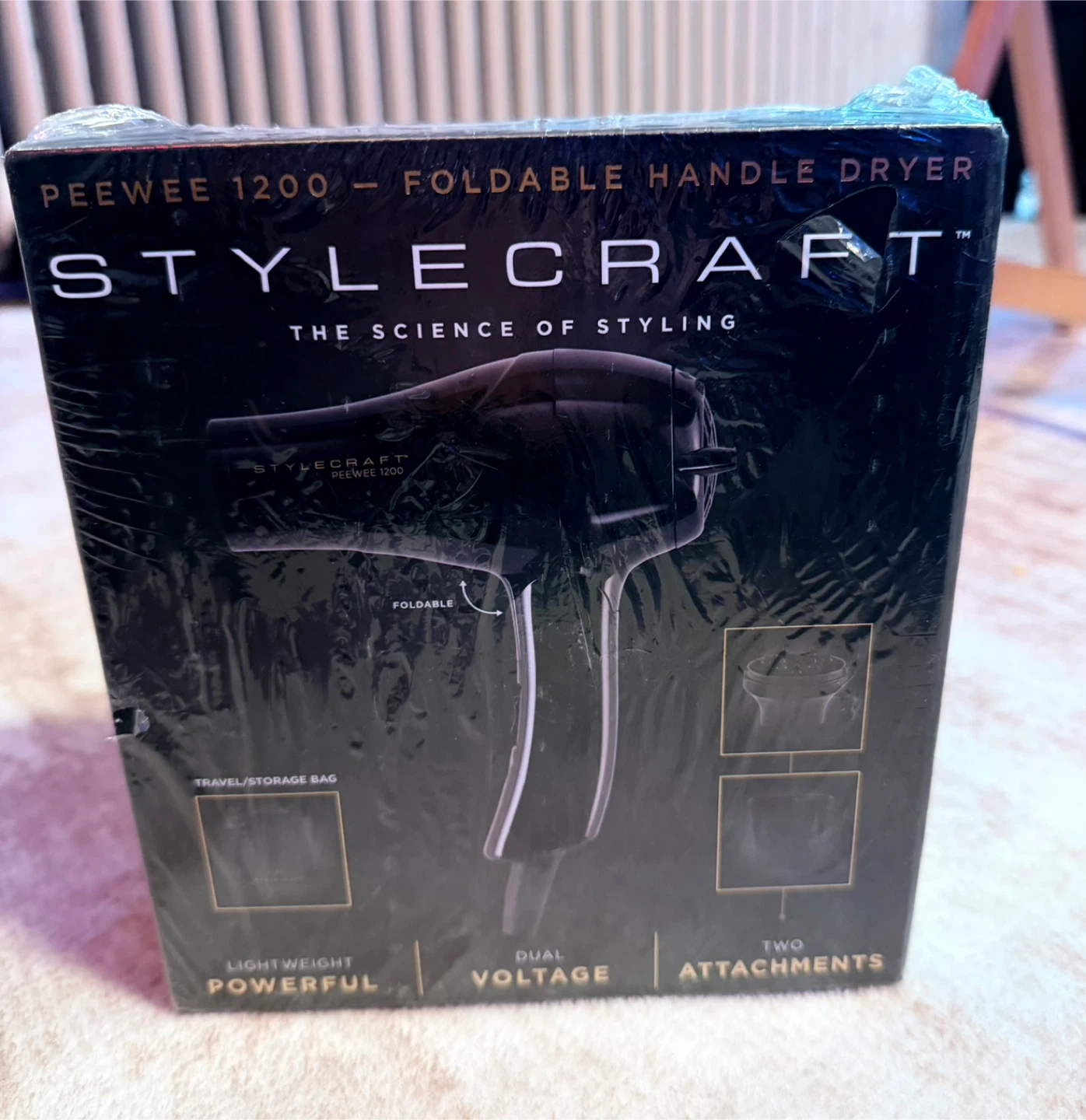 This StyleCraft Pee Wee 1200 is a compact, foldable handle hair dryer. It features Tri-Plex Fusion technology and dual voltage. Two attachments are included, along with a travel/storage bag.