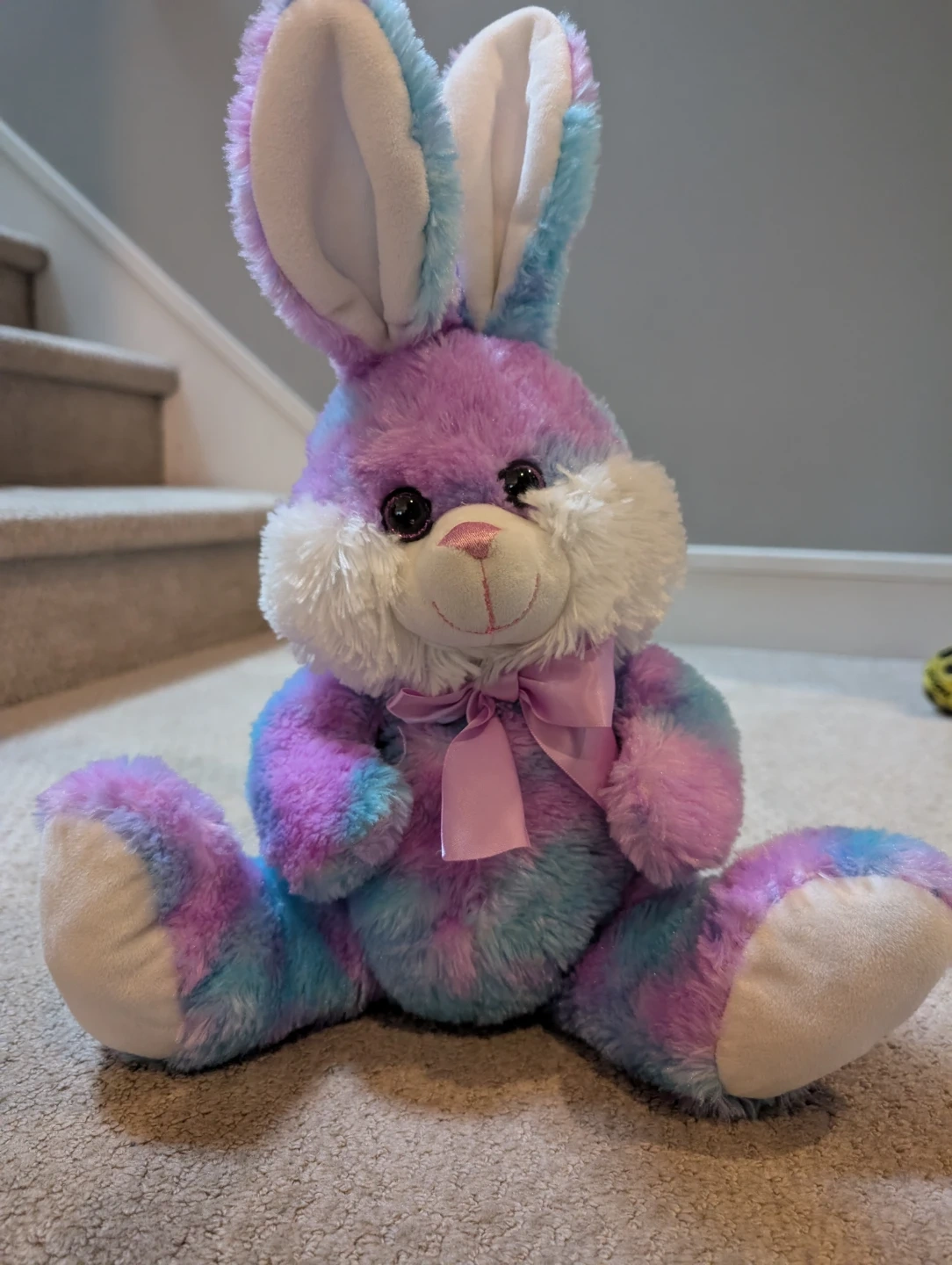 This tie-dye plush bunny has pastel purple, blue, and pink swirls all over. It's got a soft white belly and inner ears, with a pink satin bow tied around its neck. The bunny's eyes are black plastic, and its nose and mouth are stitched in pink.