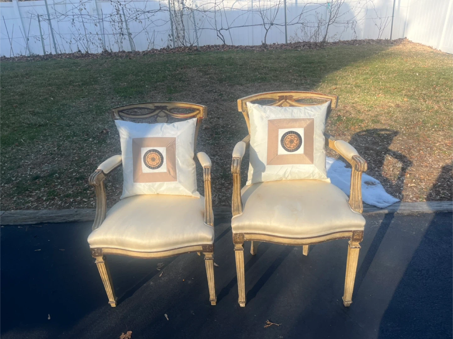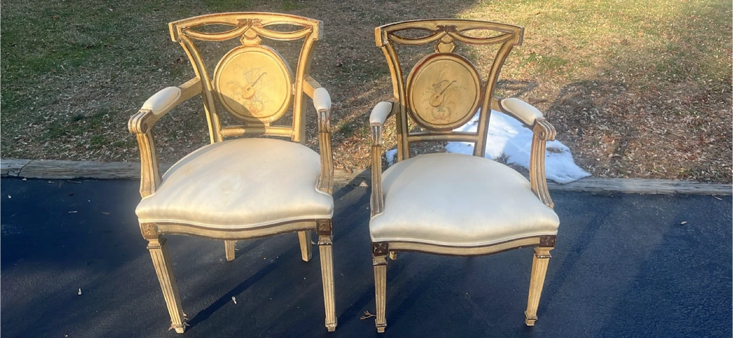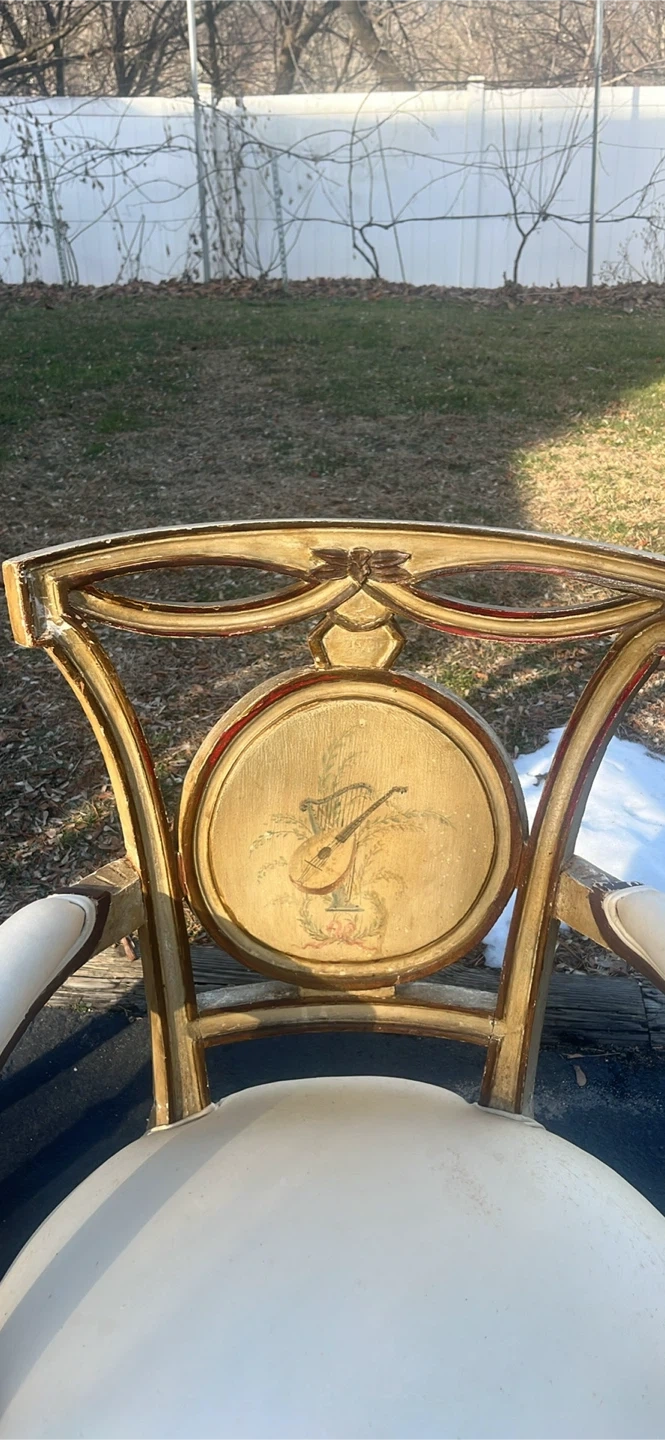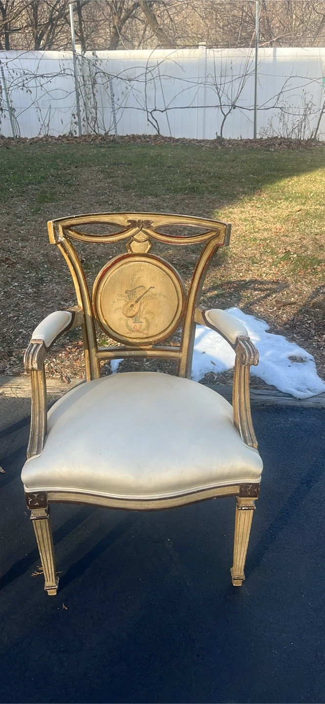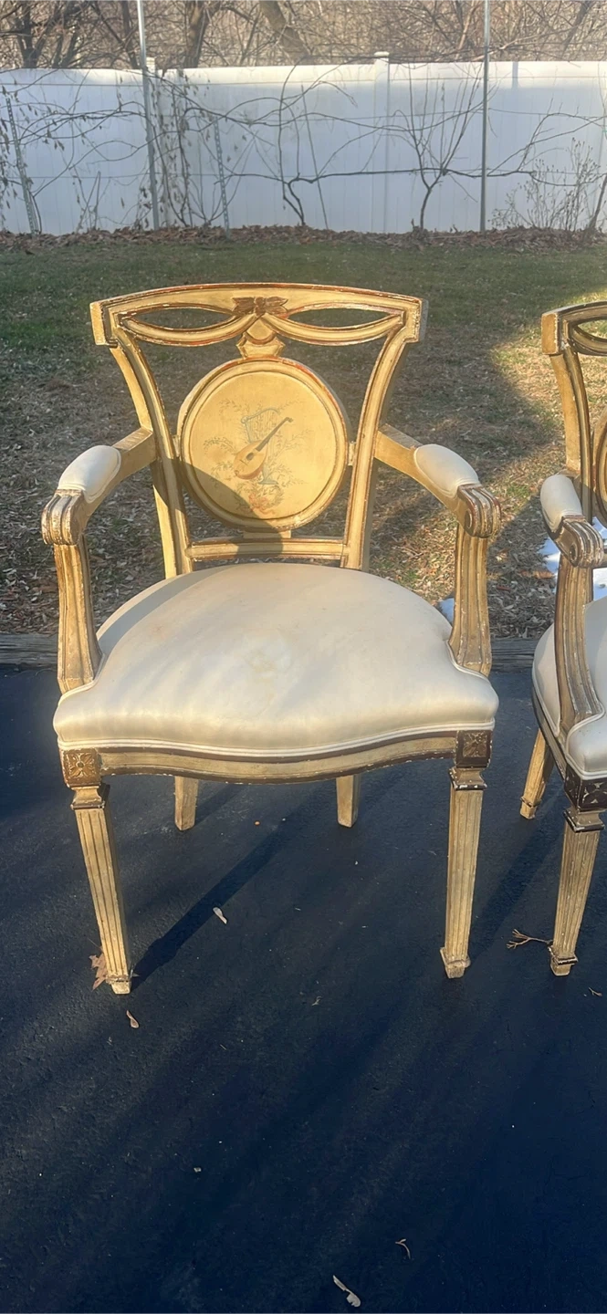 Set of two ornate accent chairs featuring a vintage musical instrument design on the backrest. Upholstered in a light-colored fabric with a padded seat and arms. These chairs have a distinct decorative style. Chairs has been in garage . Needs some cleaning . Great conditions. $350 for both . Price is negotiable.Payment is cash .