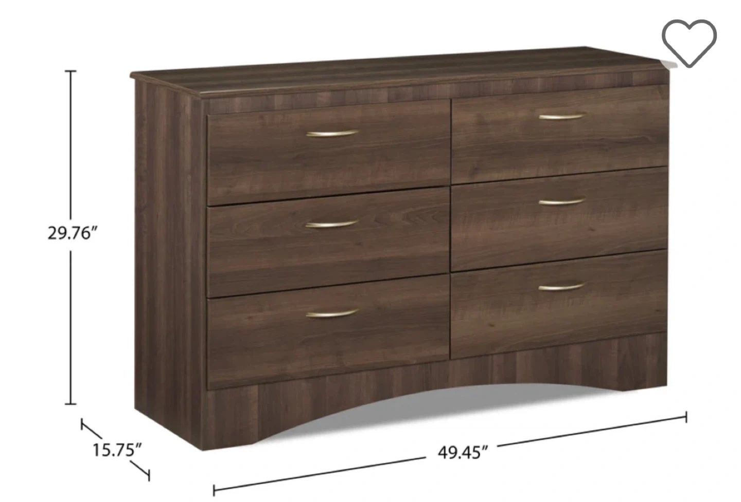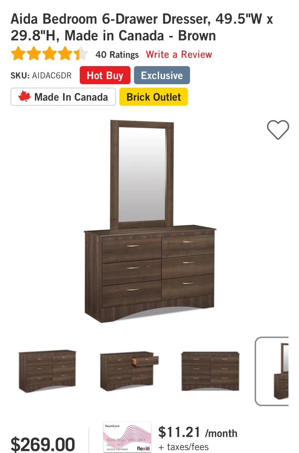 Aida Bedroom 6-Drawer Dresser. 49.5"W x 29.76"H x 15.75"D. Made in Canada. This dresser offers ample storage with six drawers. Comes with mirror