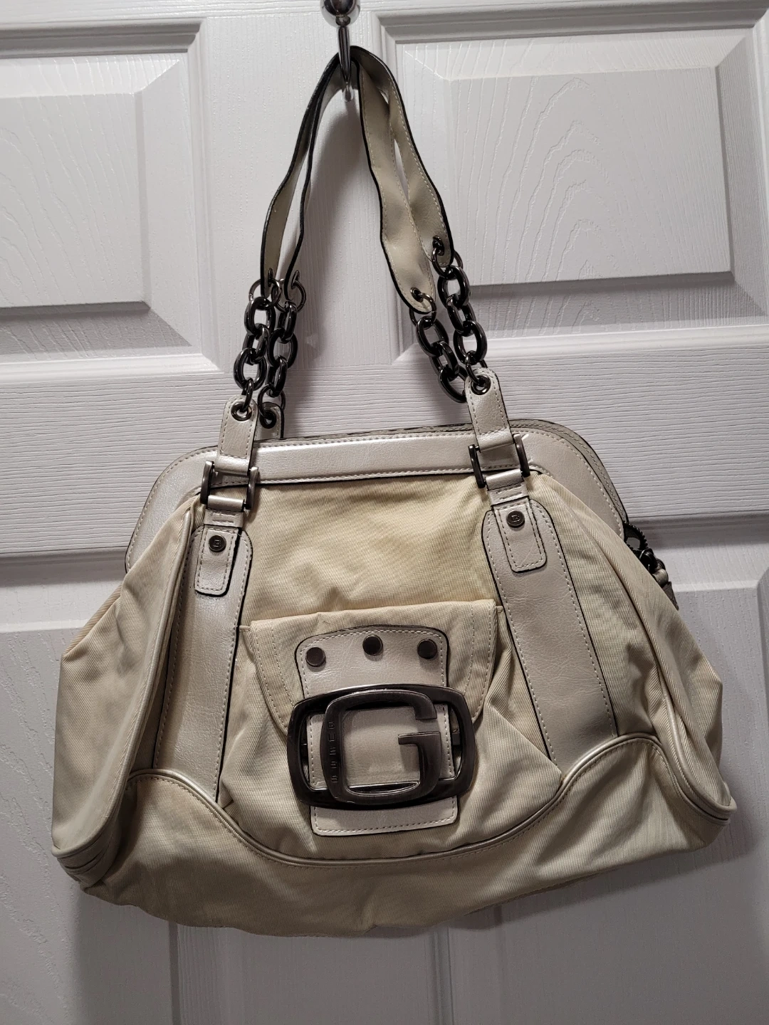 Selling a Guess purse in a cream colour! It's in great condition and has a unique chain detail on the straps. Perfect for adding a touch of style to any outfit
