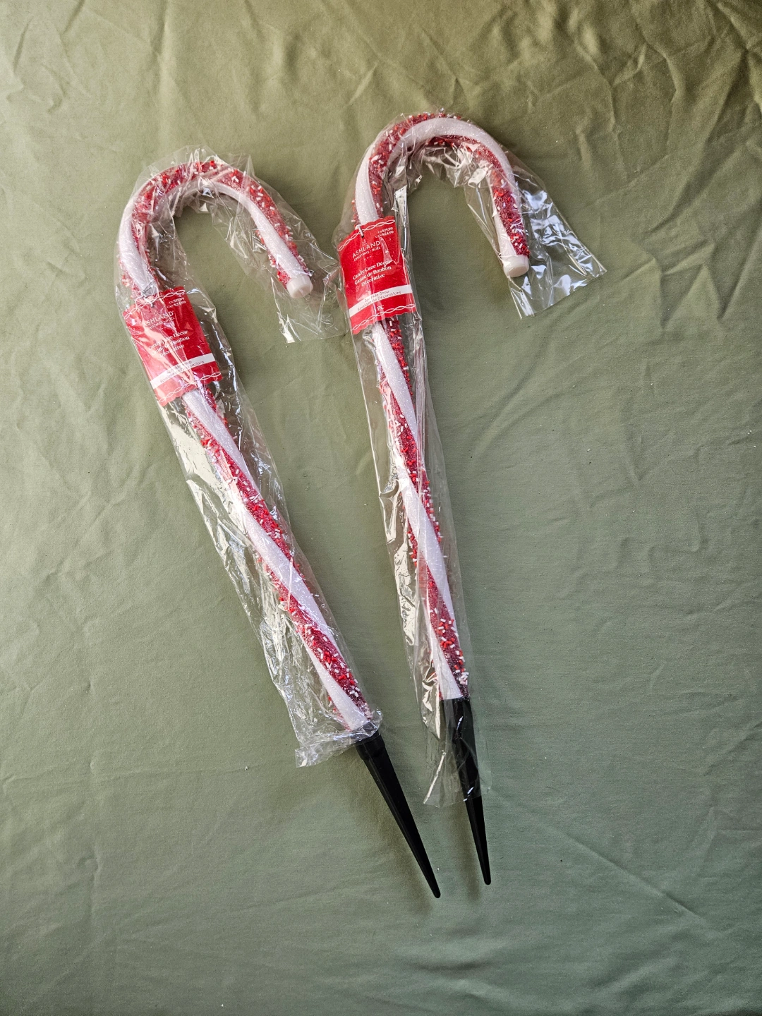 Two festive candy cane decorations. Red and white swirl design. Black pointed stakes for outdoor use. New in original packaging.