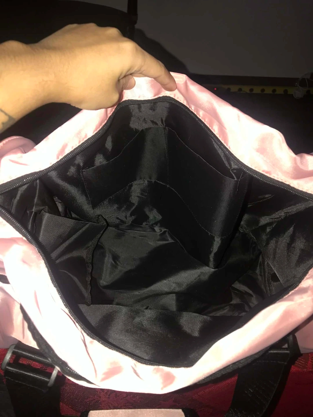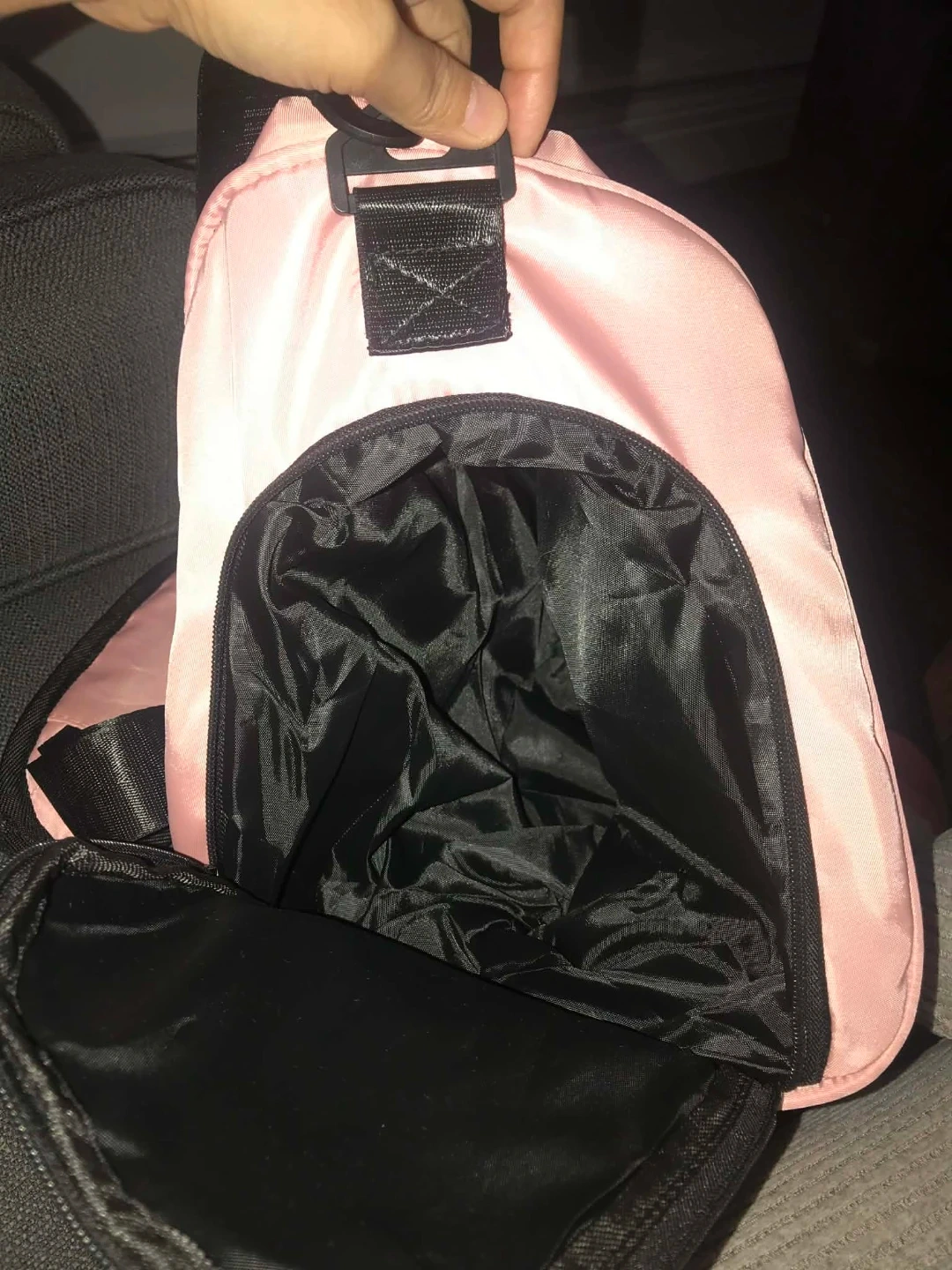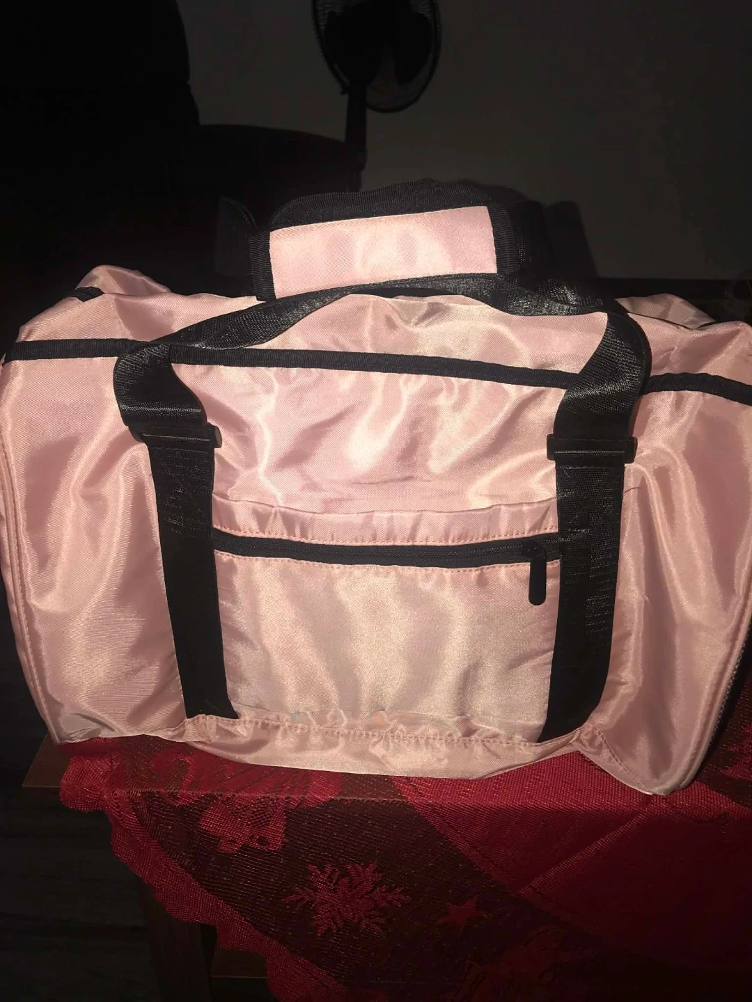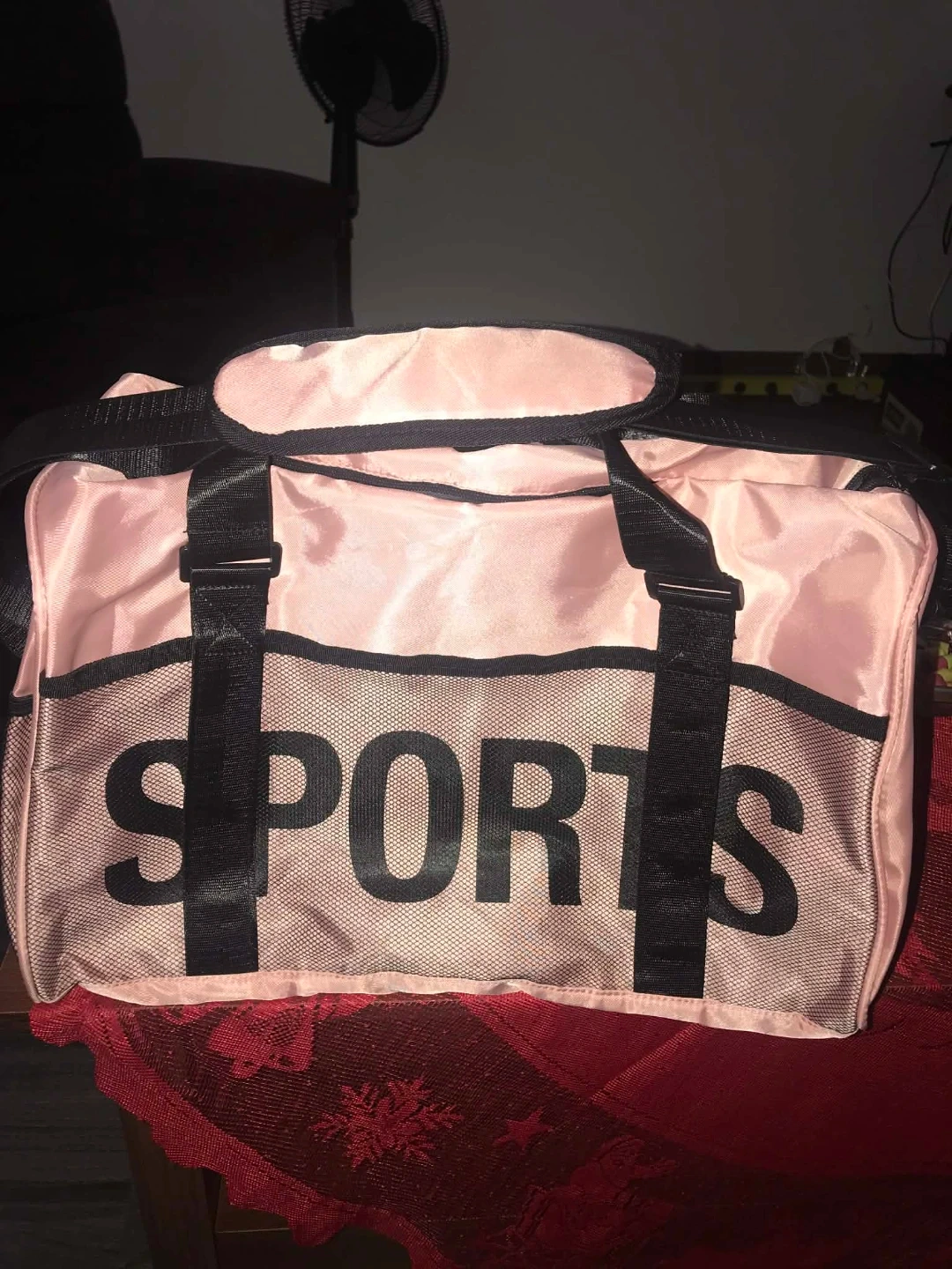 Selling a cute pink duffle bag with 'SPORTS' printed on the front. It has black straps and trim, and a spacious interior with multiple pockets for organization. Perfect for the gym or a weekend getaway!