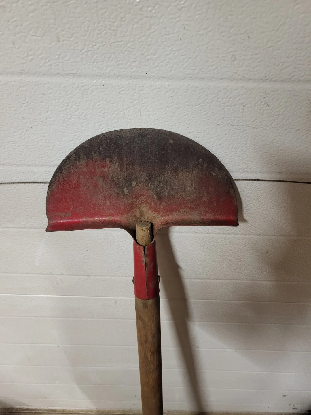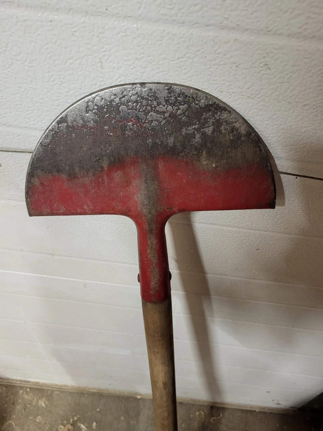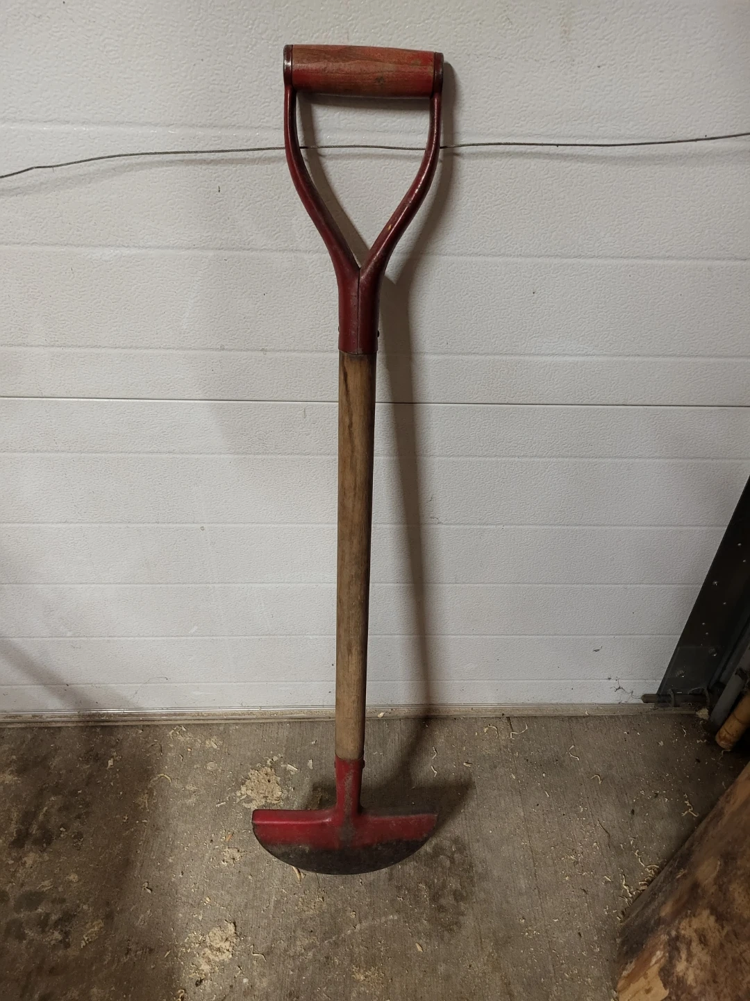 This is a half-moon edging spade with a wooden handle and a red painted metal head. It's ideal for garden bed edging.