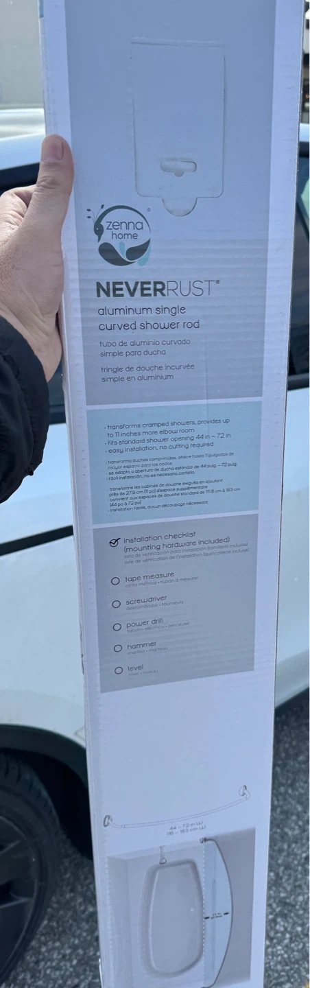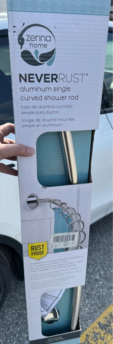 Zenna Home NEVERRUST aluminum single curved shower rod. Transforms cramped showers, providing up to 11" more elbow room. Fits standard shower opening 44 in - 72 in. Includes installation hardware.