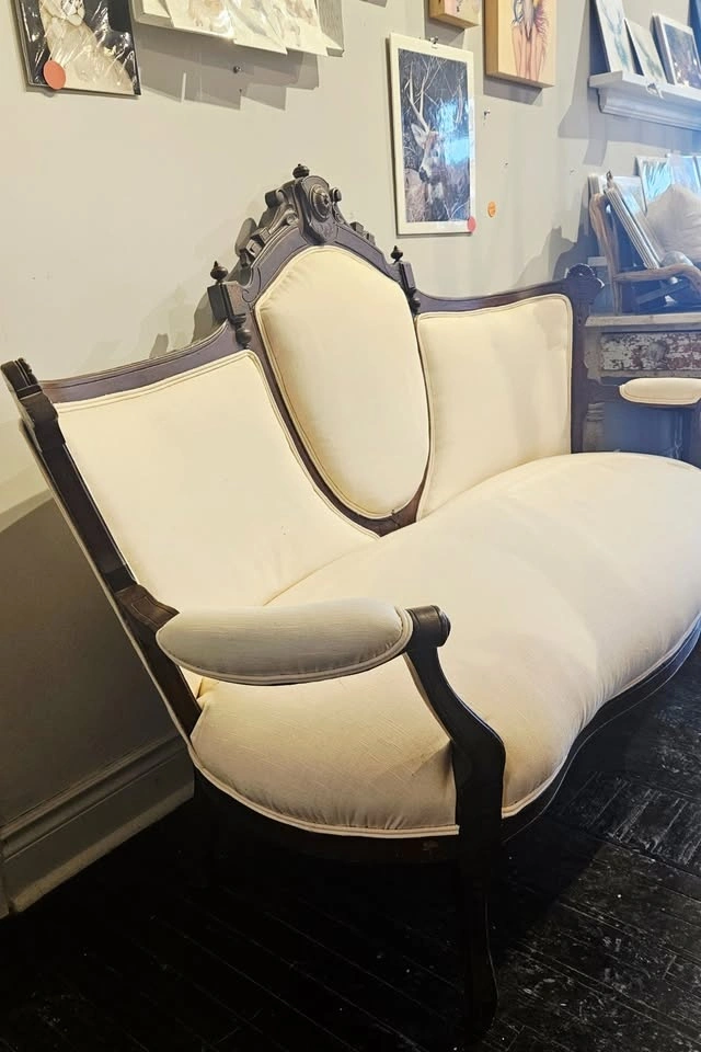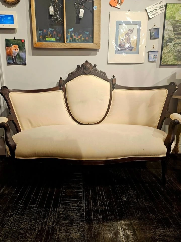 Reupholstered antique renaissance revival sofa settee. Dimensions are 31.5" depth x 69" width x 44" height, with a seat height of 17". It has been used as a display piece. The back is a bit wobbly and could use reinforcing, or it can be placed against a wall if using as functional furniture.
