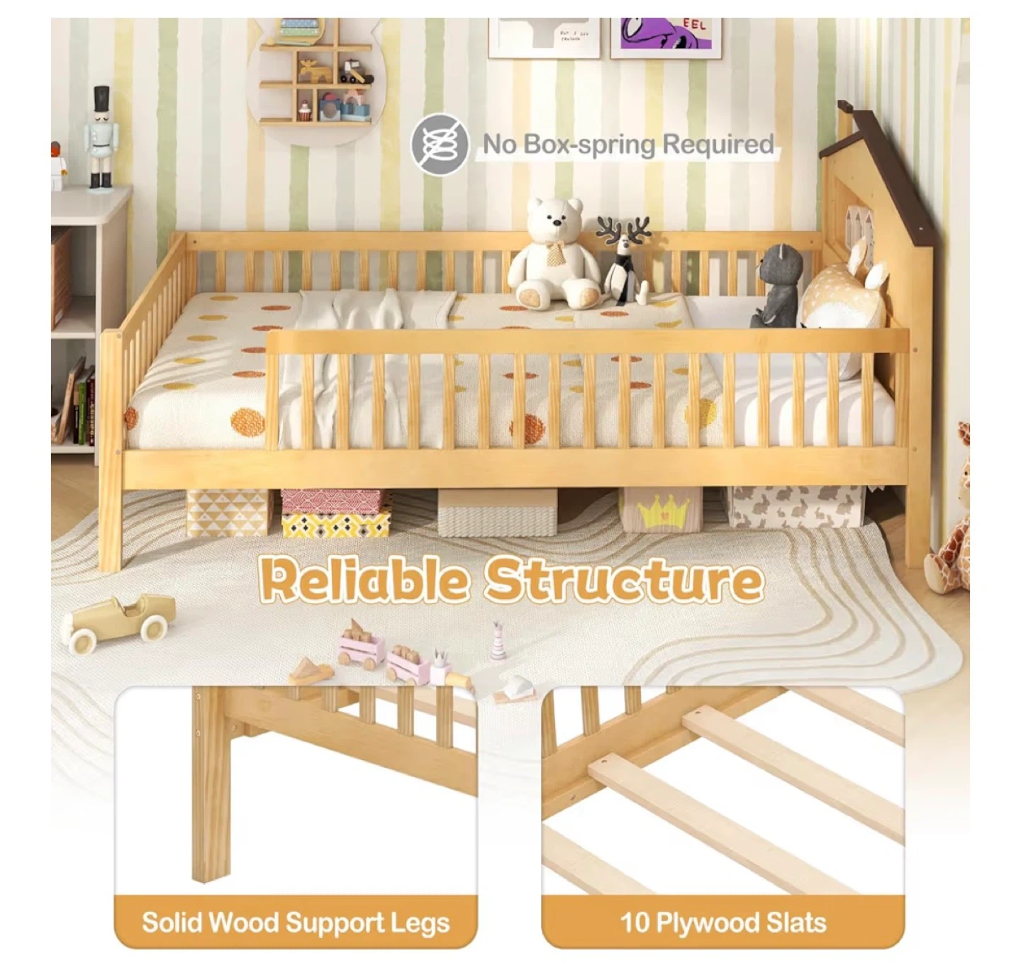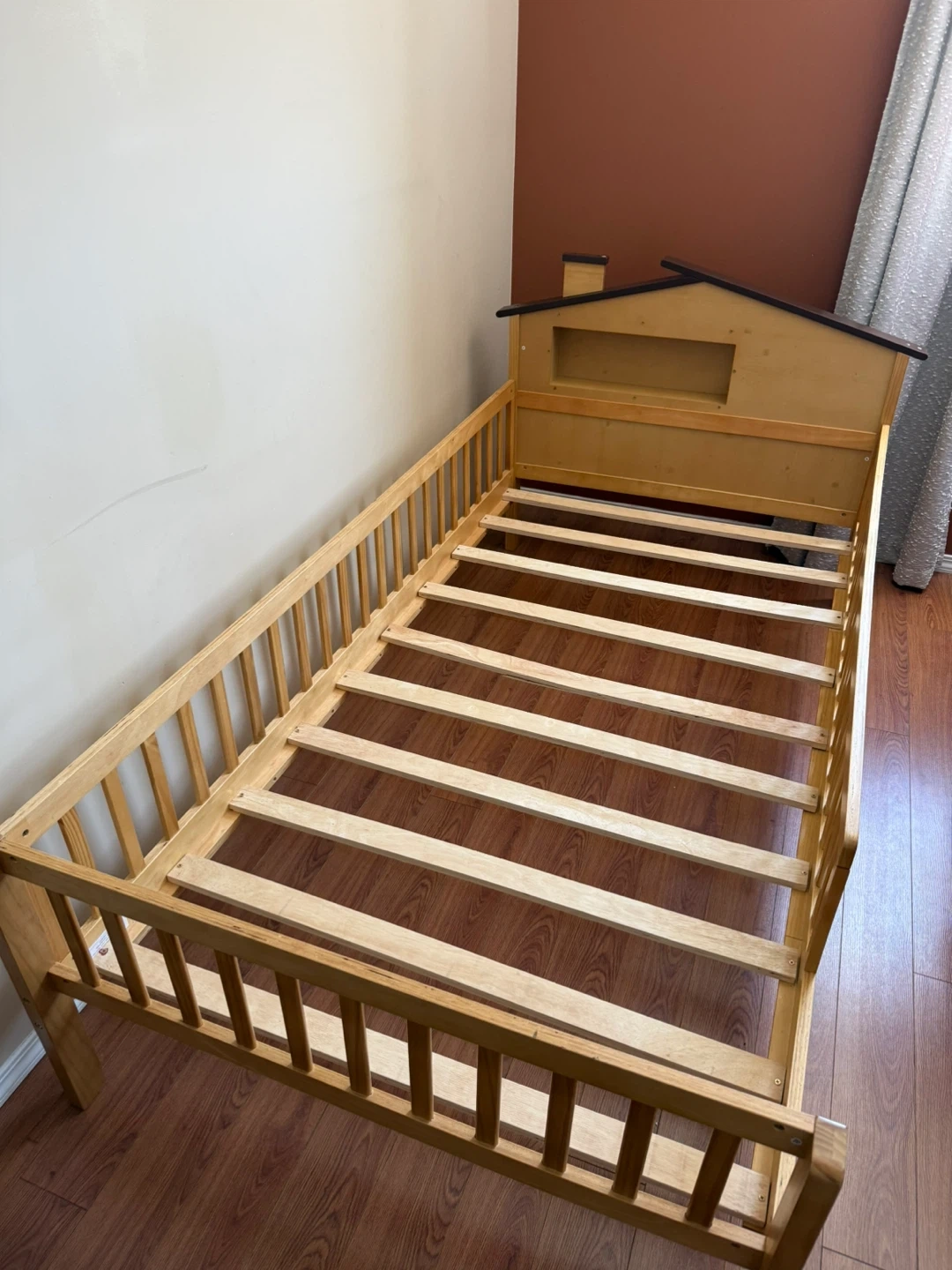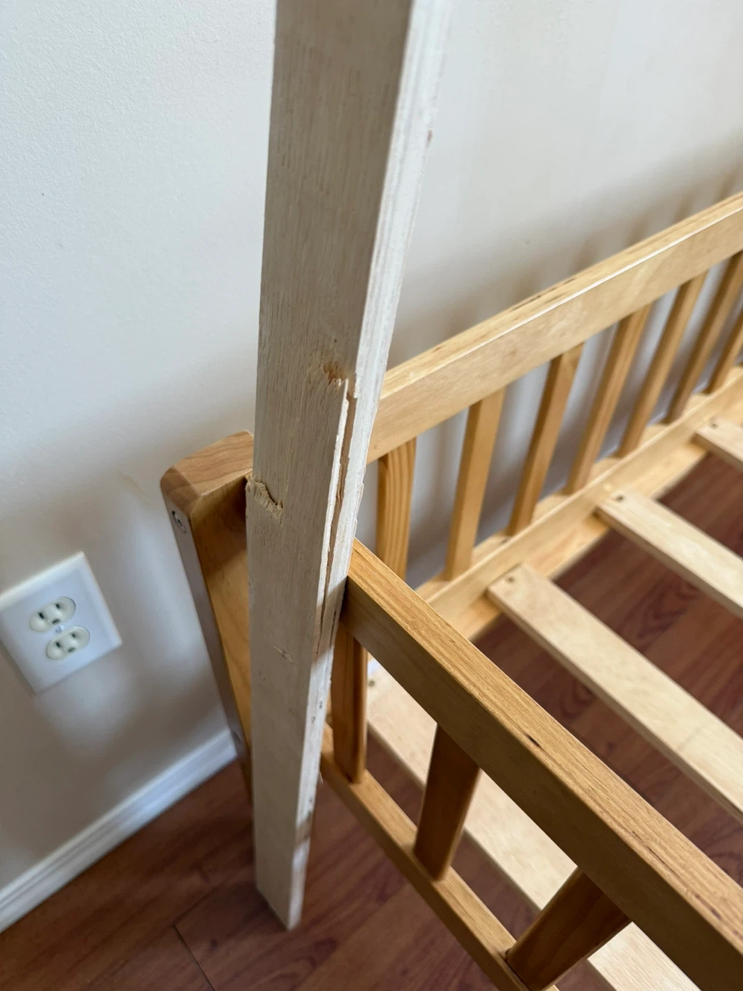 One slat go damaged during moving but other than that bed is in great condition as toddler doesn’t sleep there since we bought it. I believe it might be fixed by someone who’s handy or replaced.