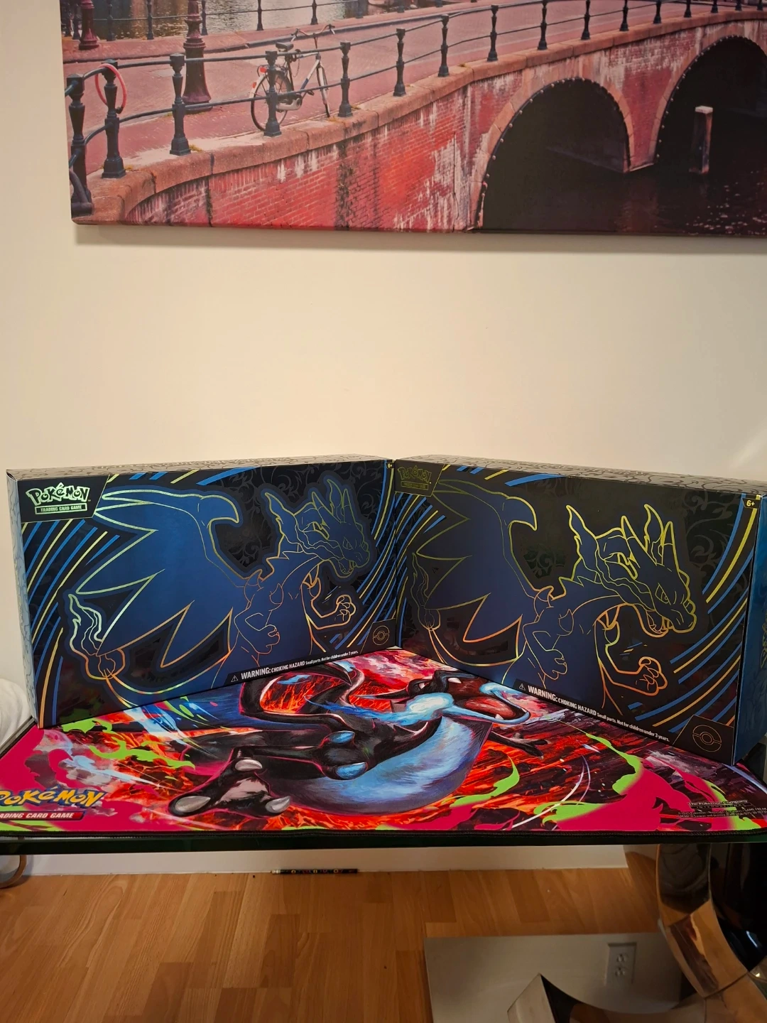 Boxes are containing the dice/coins and a Charizard mat. Our son is willing to part for