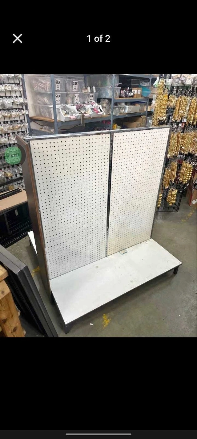 I'm selling a versatile peg board display, perfect for organizing and showcasing merchandise in retail settings or for use in workshops and craft rooms. This display includes the peg boards, metal supports, and base, offering a sturdy and adaptable solution for various display needs. Please note that this item is in used condition, showing signs of wear but fully functional and ready to use. Specifications: * Type: Peg Board Display * Condition: Used If the ad's up, it's still up for grabs!