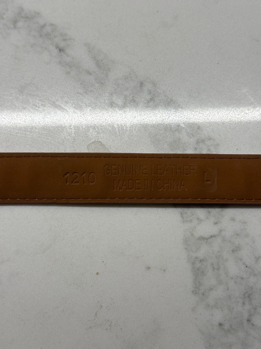 Classic brown belt crafted from genuine leather. Features a silver-toned buckle and white stitching detail. Made in China. Its a size L but fits a XS. Never worn.