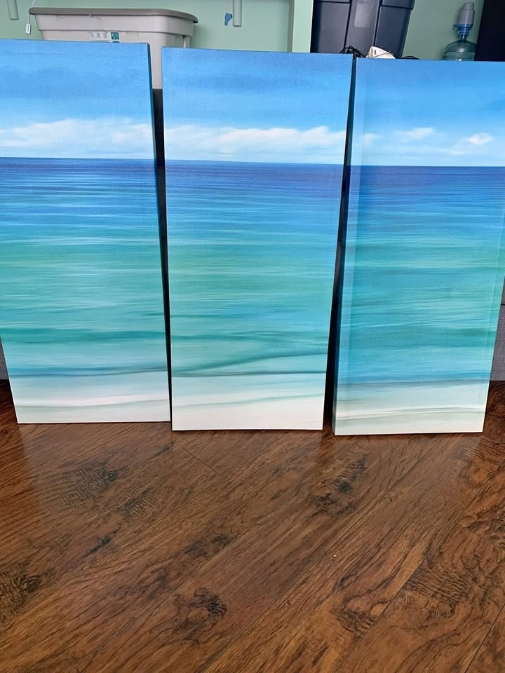 3-piece ocean beach canvas wall art. Perfect for living room, bedroom, or office. Each panel is 13" wide x 29" tall. Total width when hung is approximately 39" (with spacing). Features a calming turquoise and blue ocean scene.