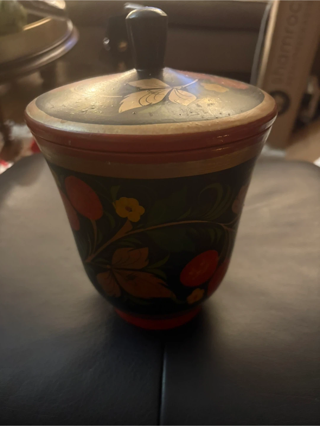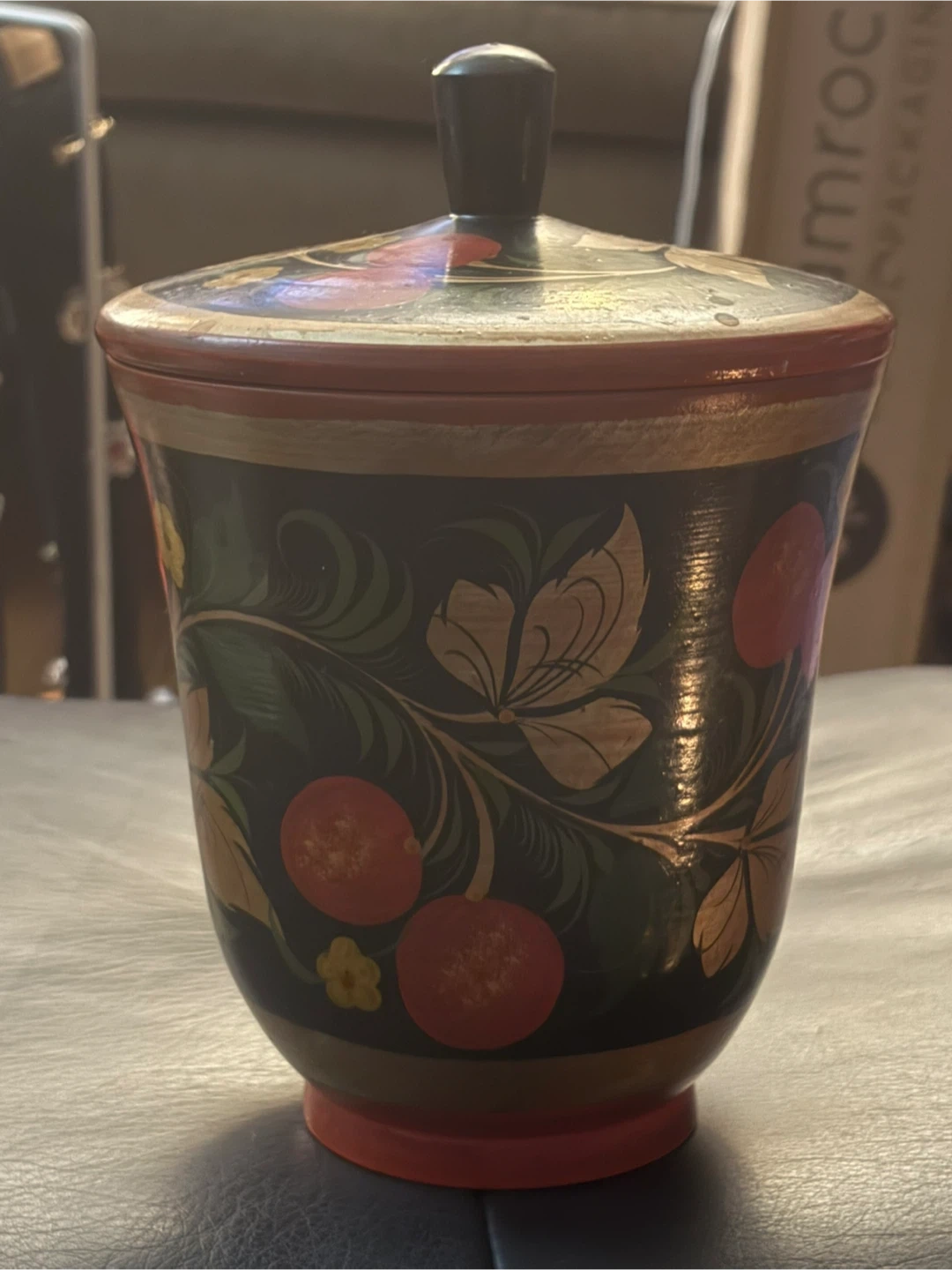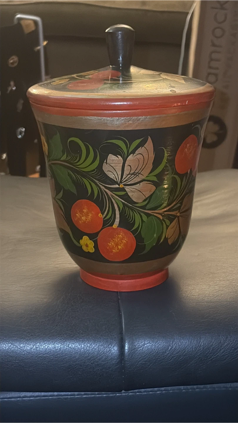 🏆This is a Russian Khokhloma hand-painted wooden sugar bowl or container.