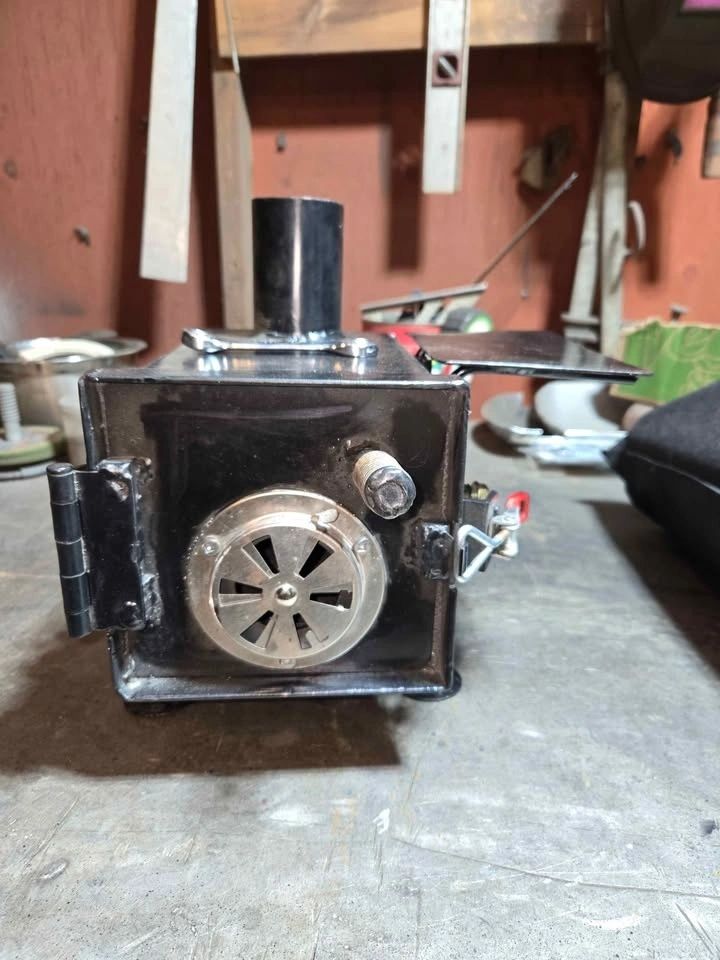 Looking for a reliable, ultra-portable heat source for your hot tent, ice shack, or workshop? This custom 6x6x8 inch stove is built for efficiency and ease of transport. Key Features & Specs: Compact 6" x 6" x 8" firebox—perfect for small spaces. Comes with a custom wrench to easily adjust height and level the stove on uneven terrain. Includes a detachable warming tray (perfect for coffee or keeping food warm) and a spring for stay-cool door handle. Complete stainless steel flue system including multiple interlocking pipe sections, a 90° adjustable elbow for versatile venting, an integrated damper for precise airflow and burn-rate control, and a spark arrestor section for safety. Silicone Roof Flashing (Stove Jack) included for easy tent installation. Freshly coated in high-heat resistant black paint. Everything packs down neatly into the included heavy-duty carry bag. Excellent, custom-built condition. Paint is fresh and drying. Ready for its first burn!