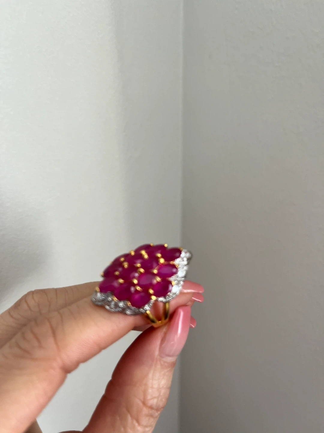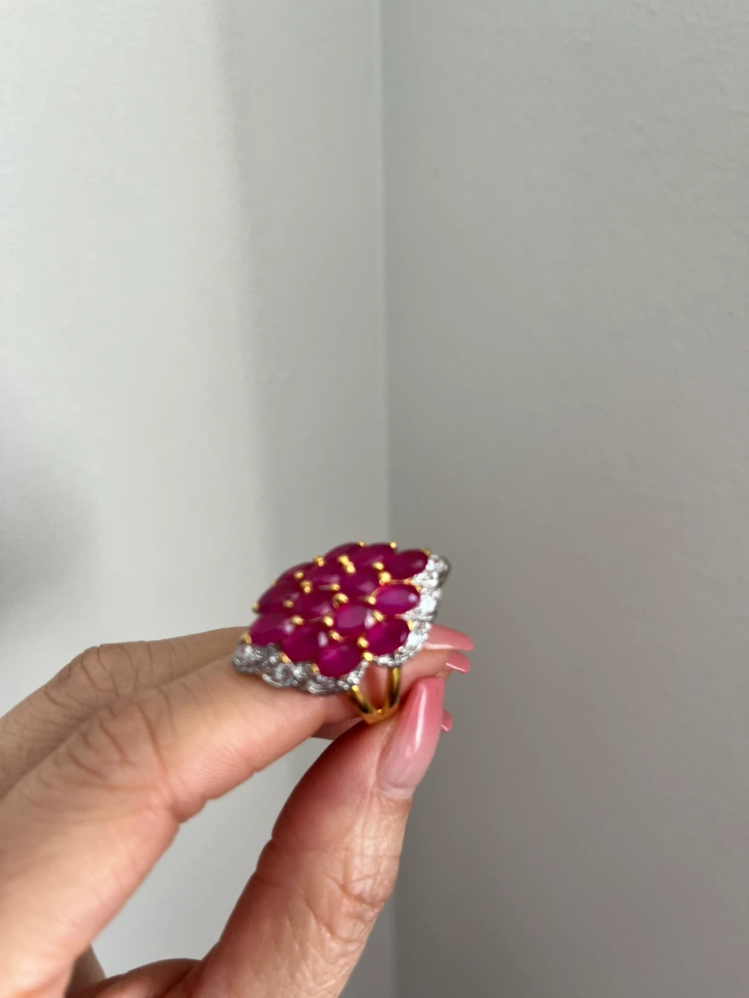 This statement ring features a cluster of vibrant, marquise-cut ruby-coloured stones surrounded by smaller clear stones. It's set in a gold-tone metal with an ornate, eye-catching design. This ring is perfect for adding a touch of glamour to any outfit!