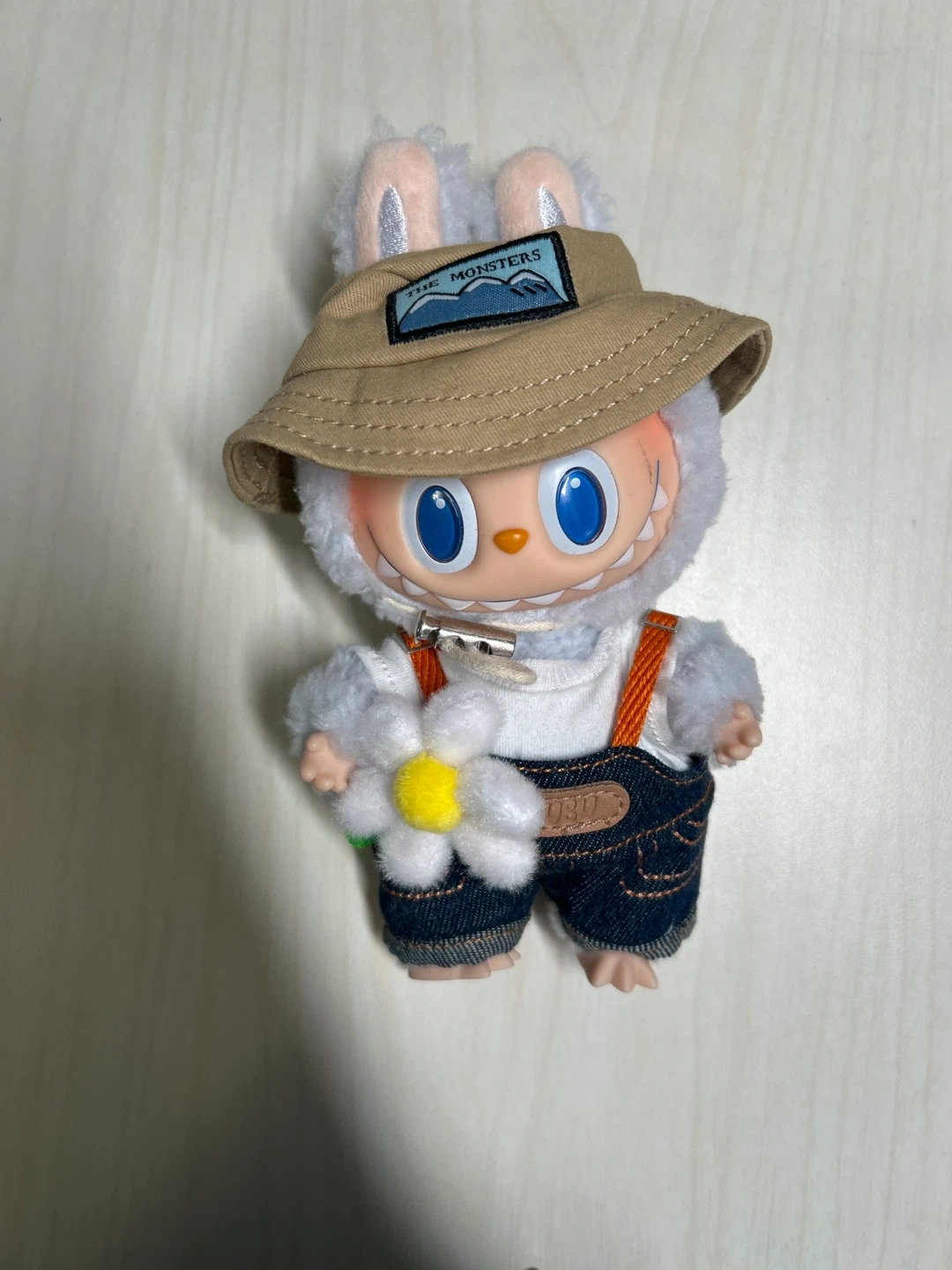 This is a soft plush toy with blue eyes and a beige bucket hat. It's wearing denim overalls and holding a white flower. The hat has a patch that says 'THE MONSTERS'.