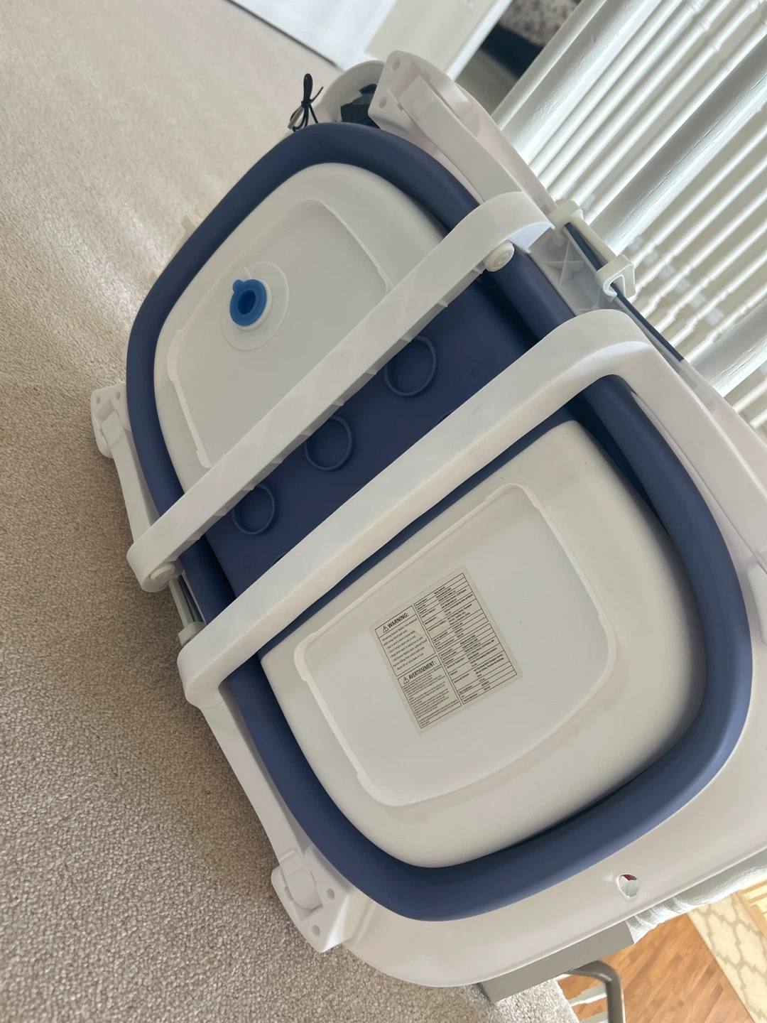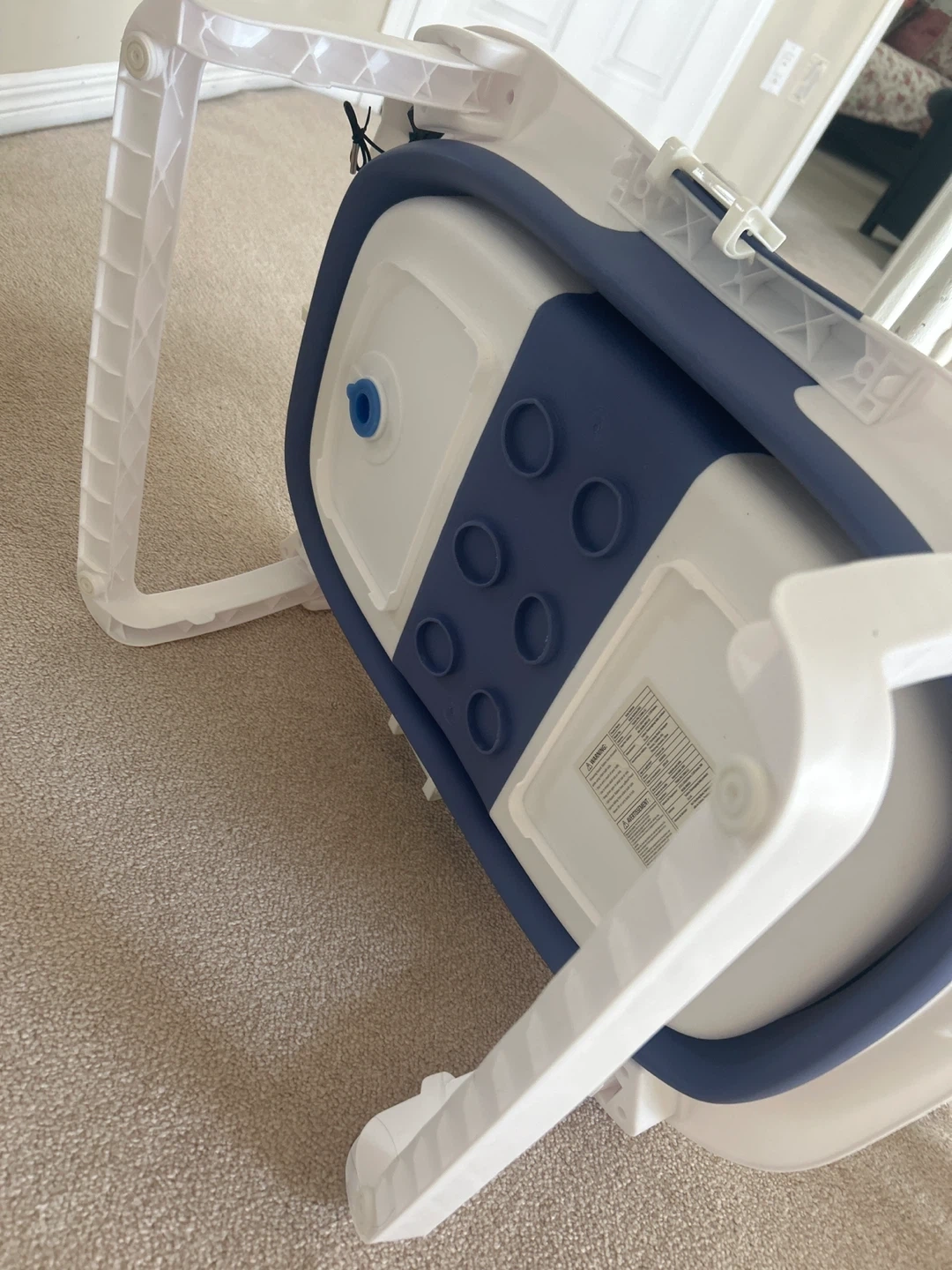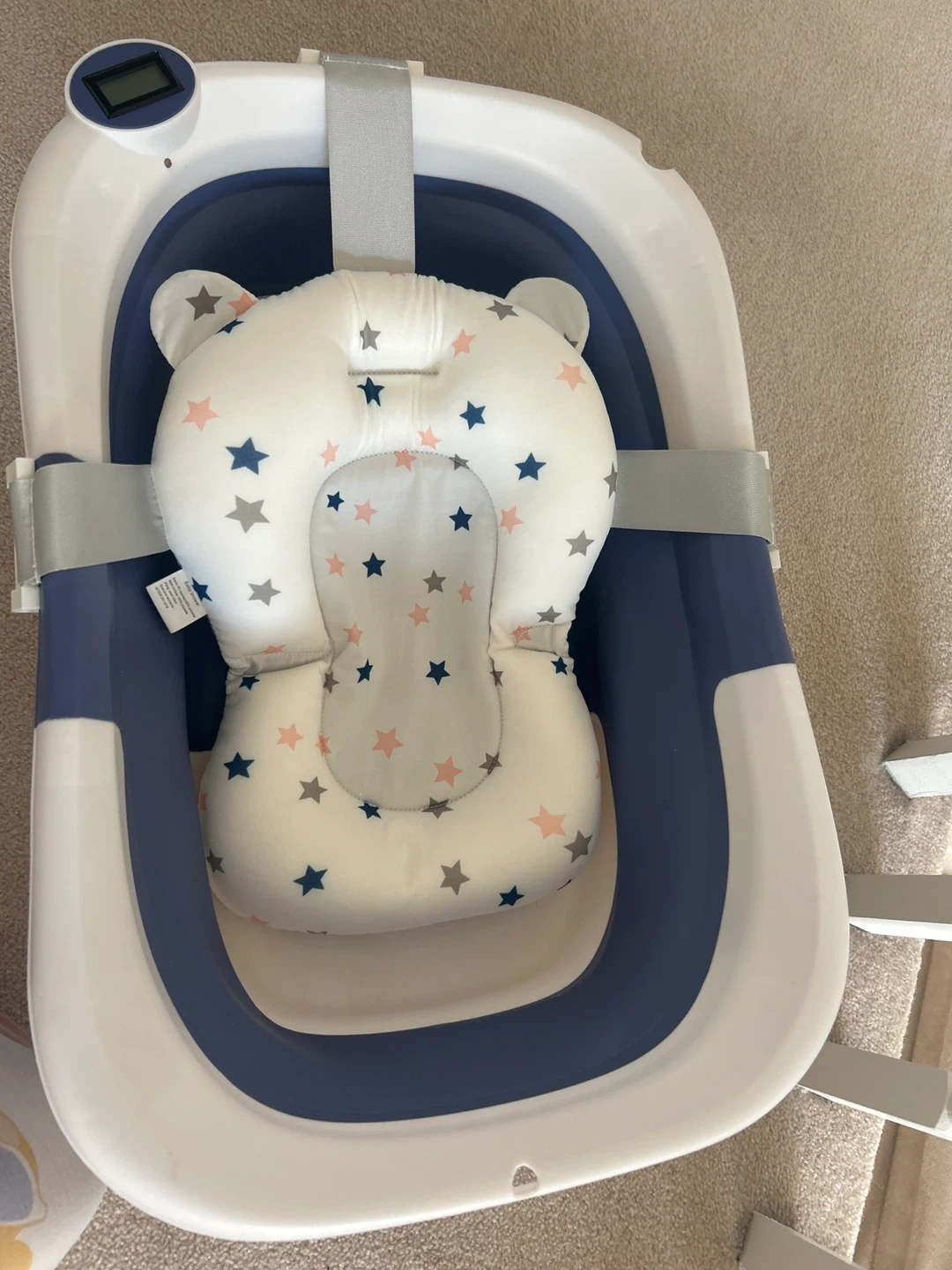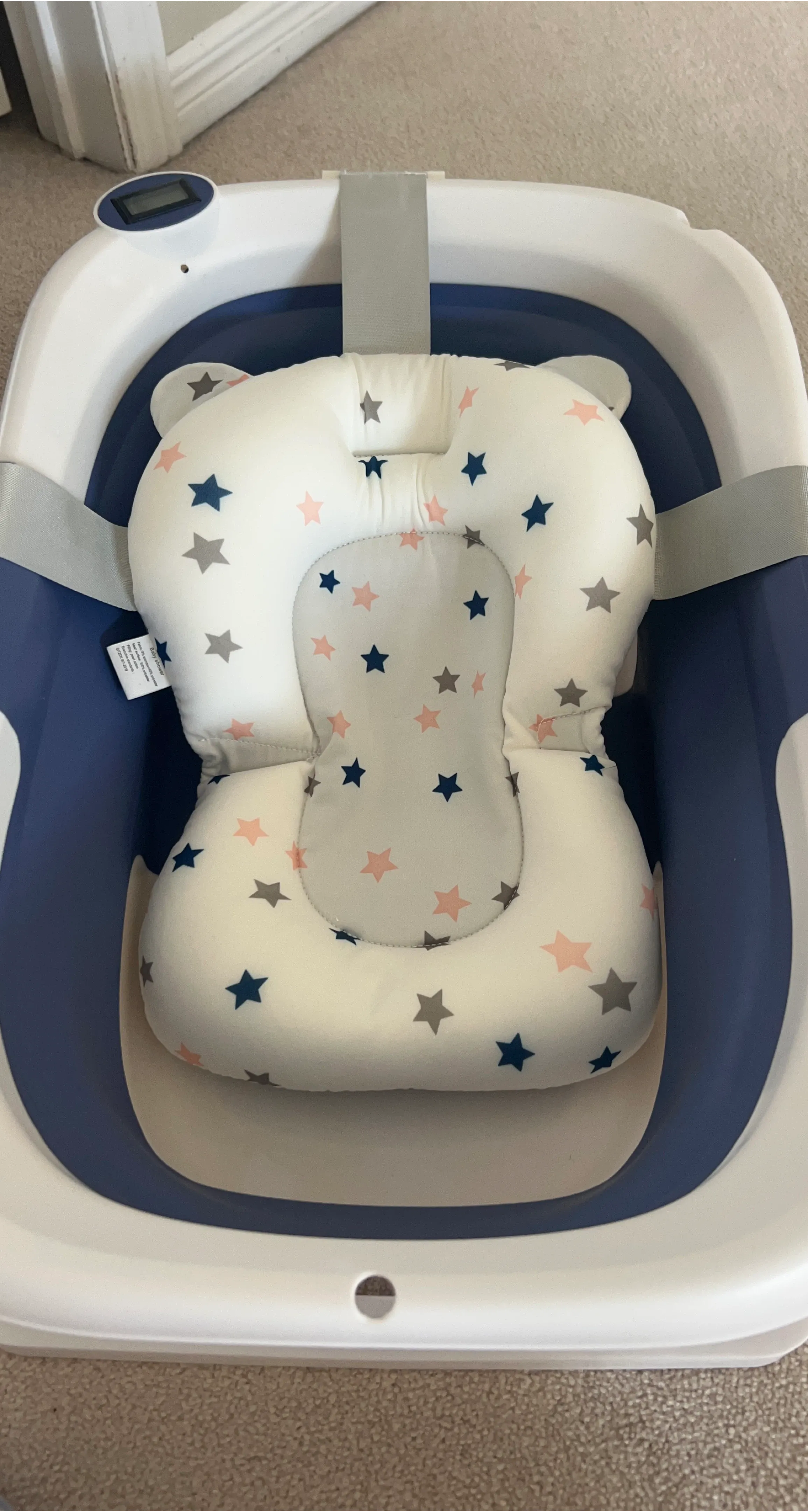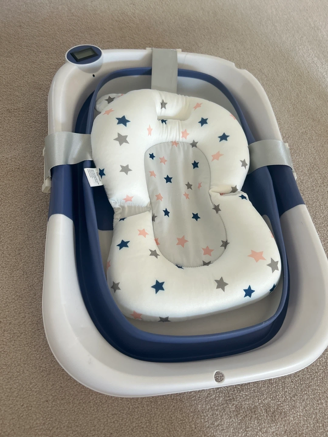 This foldable baby bathtub comes with a digital scale to easily track your baby's weight. It features a cute star-patterned infant support cushion for comfort. The tub is blue and white plastic. It's great for keeping track of your little one's growth during bath time!