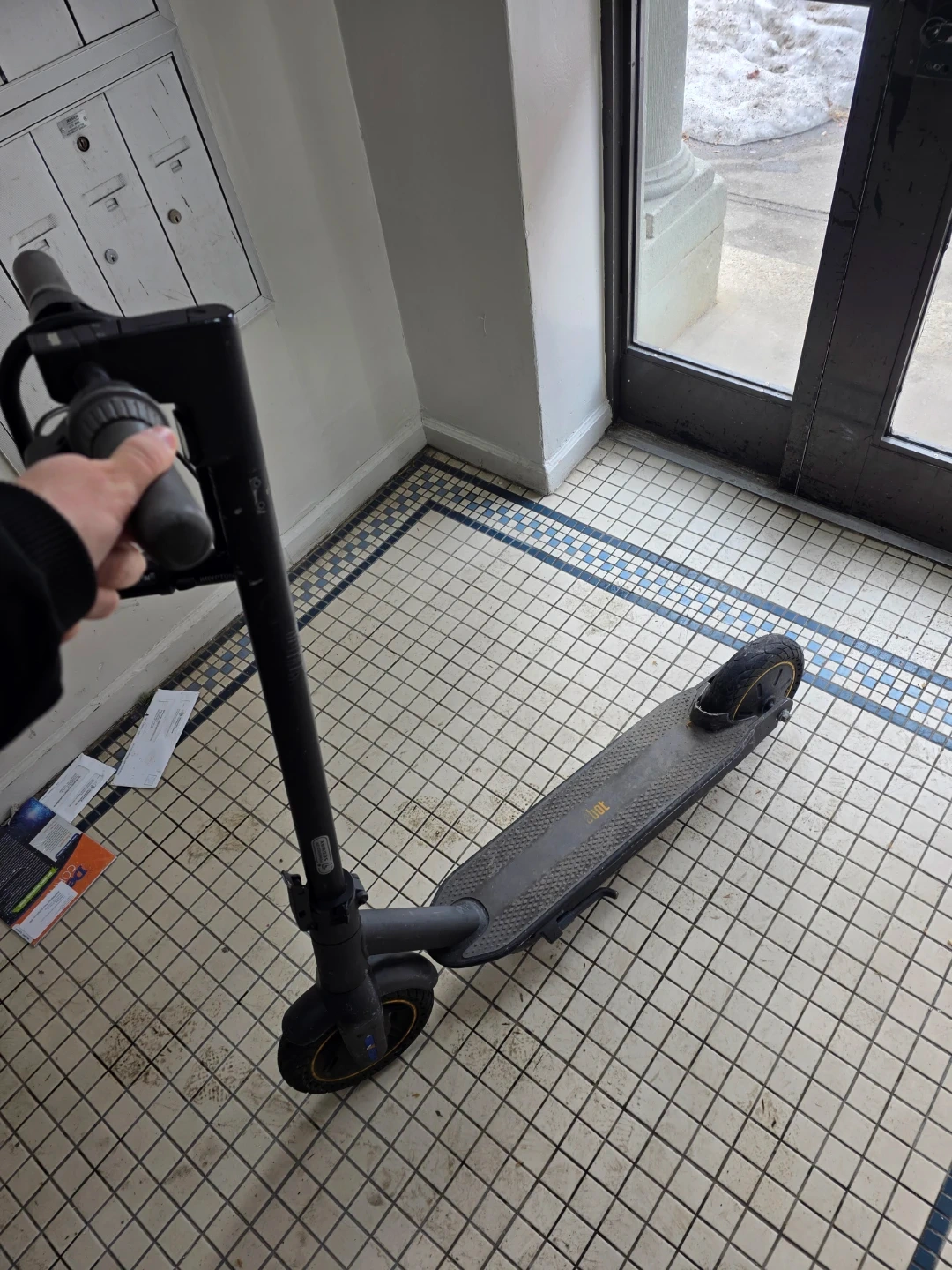 This is a Segway Ninebot electric kickscooter. It's a dark gray model with black accents. It offers a fun and convenient way to travel around town!