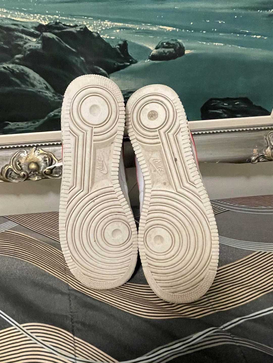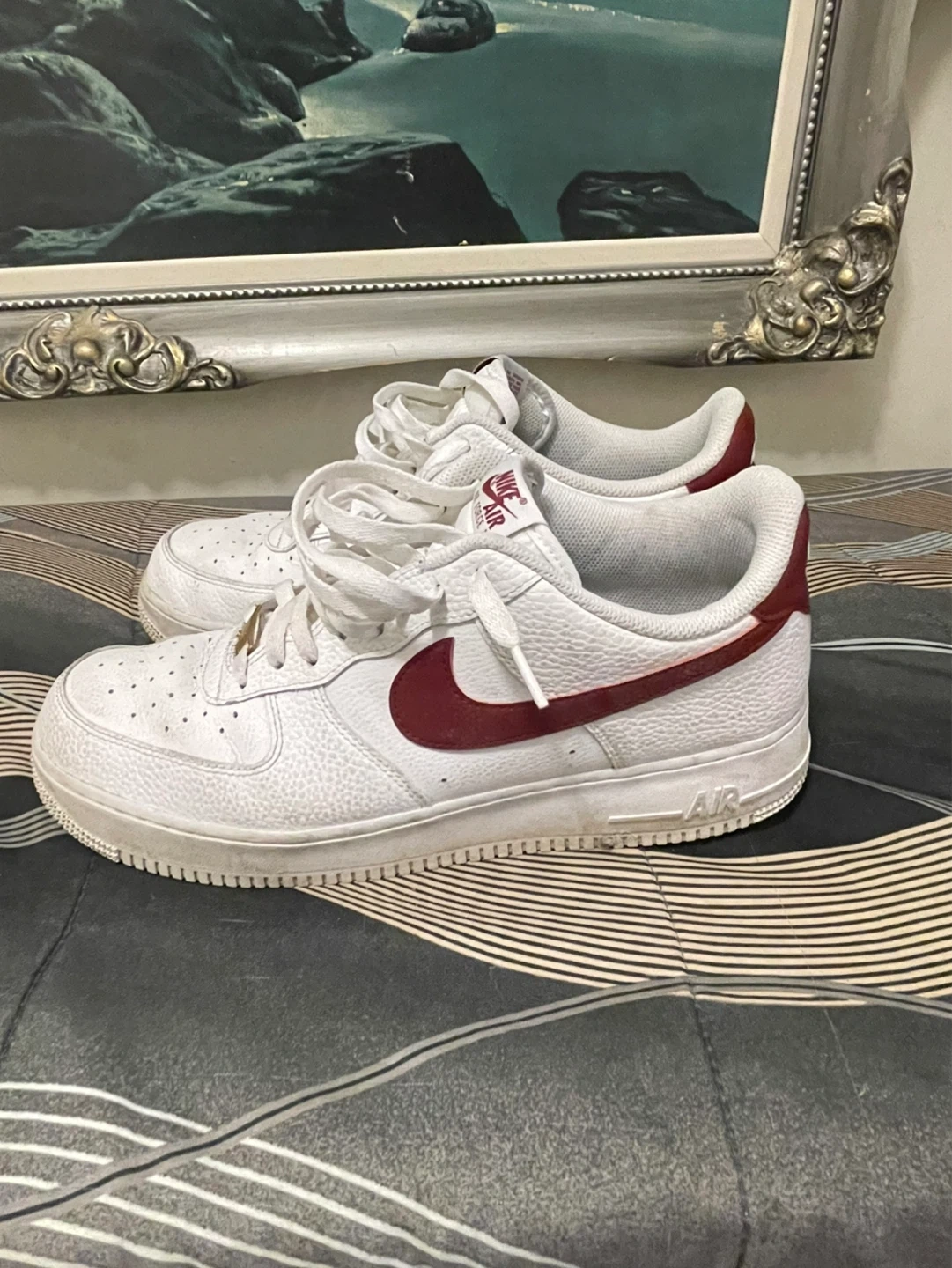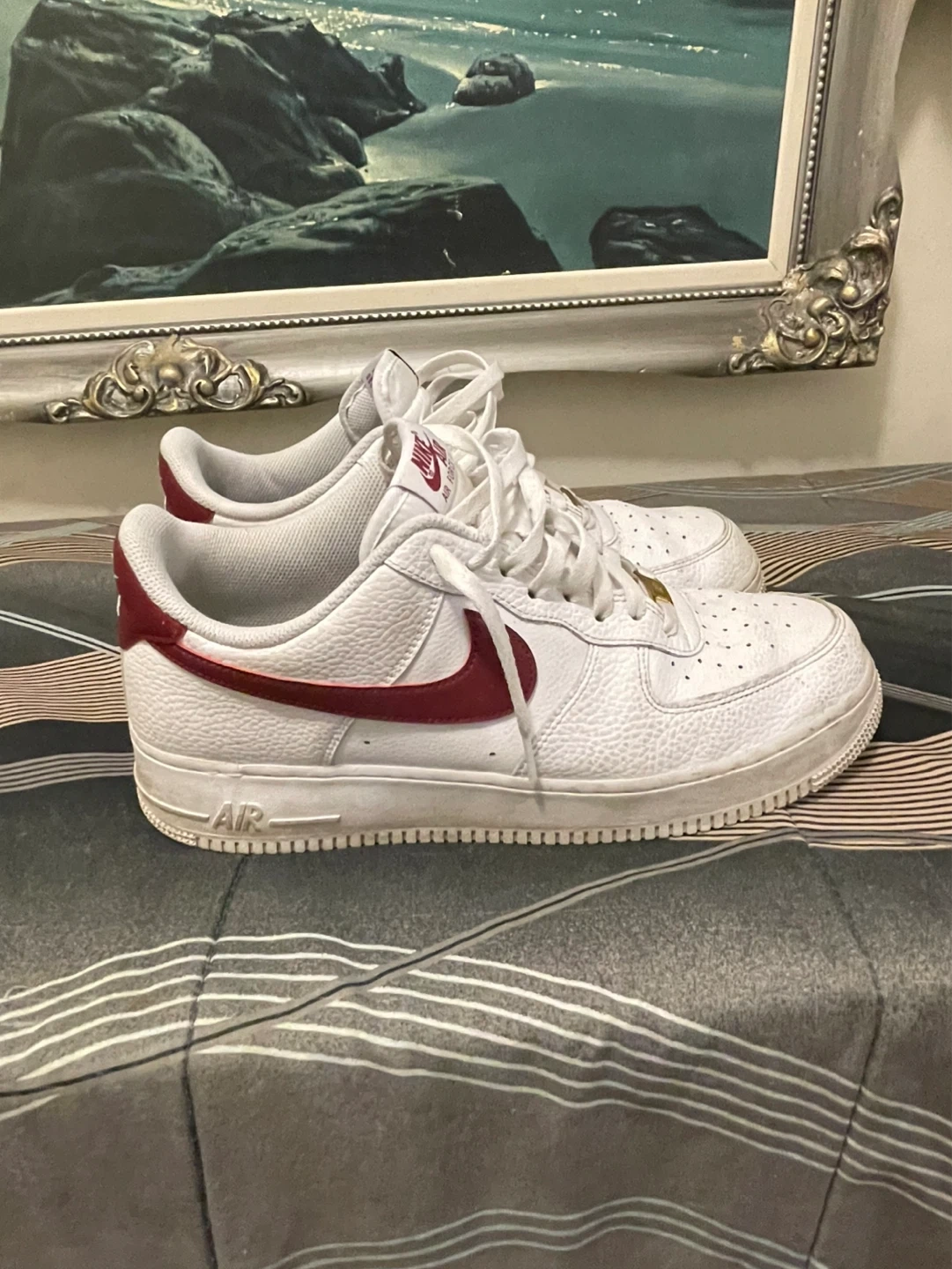 Classic white Nike Air Force 1 sneakers with burgundy accents. Men's US size 12. Leather material. And don’t worry I’m getting it cleaned up so please come see for yourself.