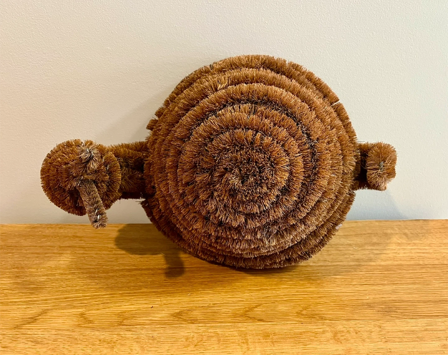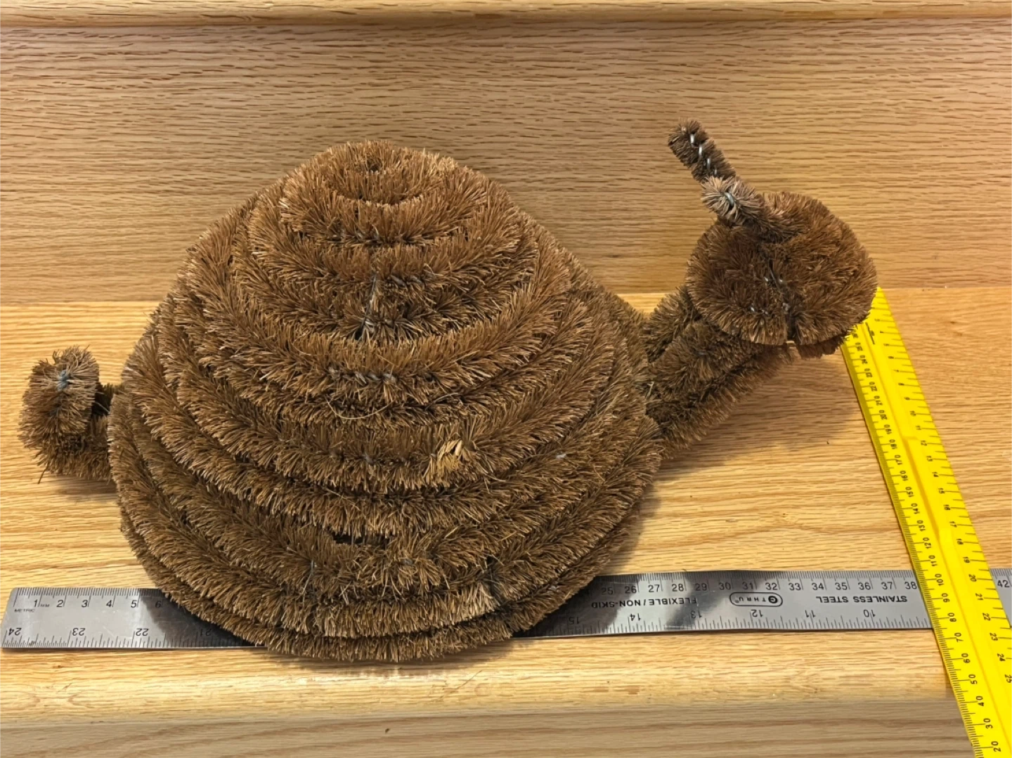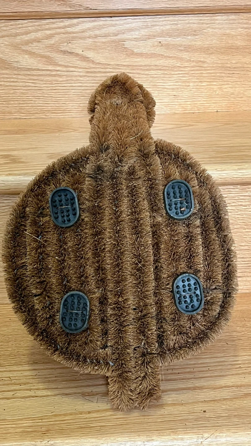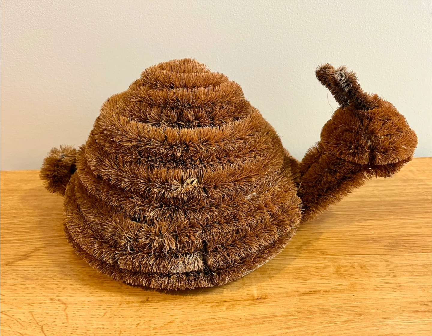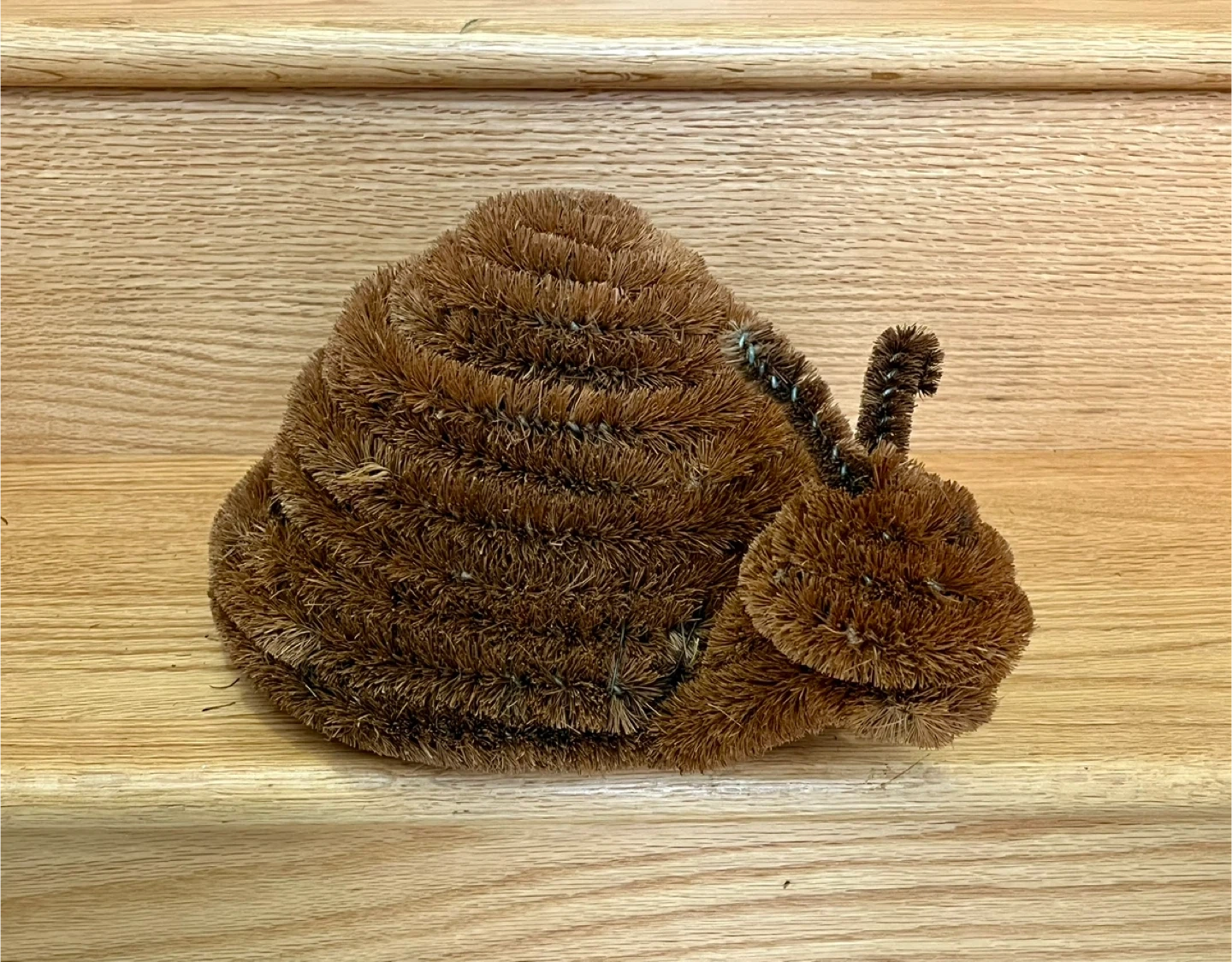 Cute snail-shaped Doormat Brush. It's made from coconut coir bristles with a wire frame and has anti-slip black rubber feet on the bottom. This scrubber adds a whimsical touch to your doorway.