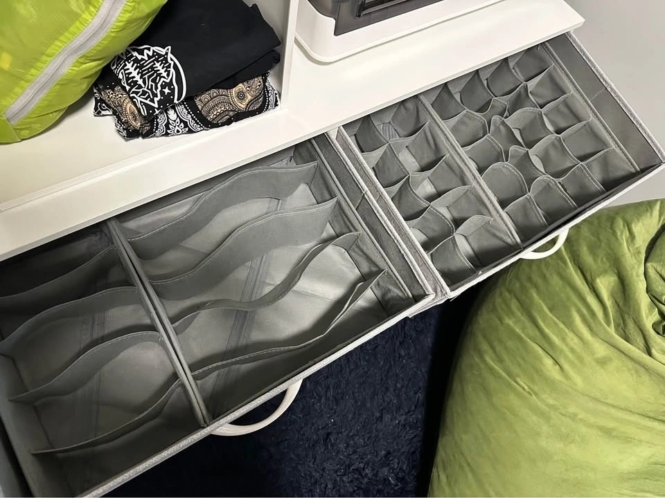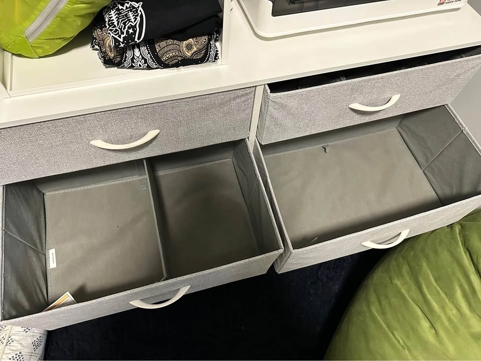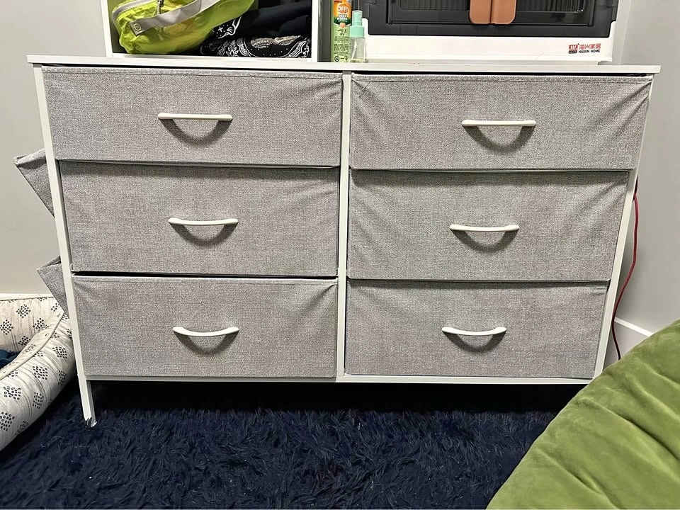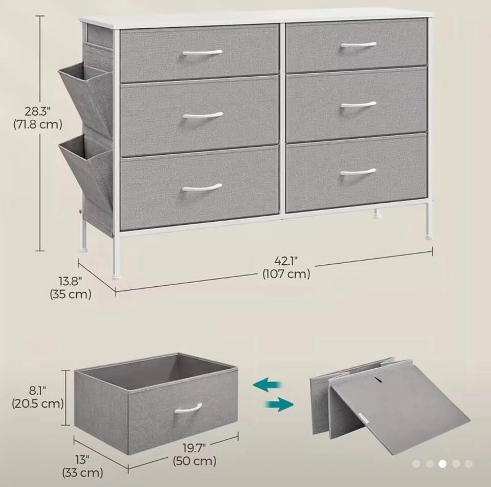 Versatile fabric dresser with 6 light gray drawers and white handles. White frame. Good for clothes, toys, or extra storage. Some drawers come with organizers inside, handy for keeping things neat.