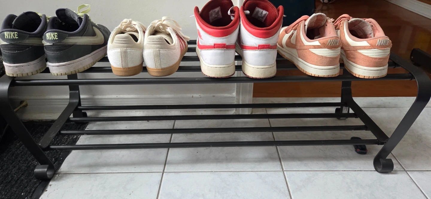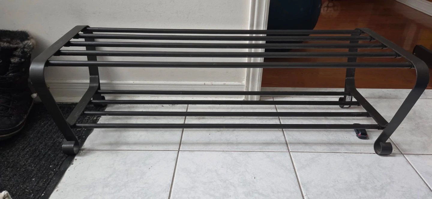 A sturdy metal shoe rack with two tiers. It's perfect for organizing footwear in your entryway or closet. This rack holds multiple pairs of shoes neatly.