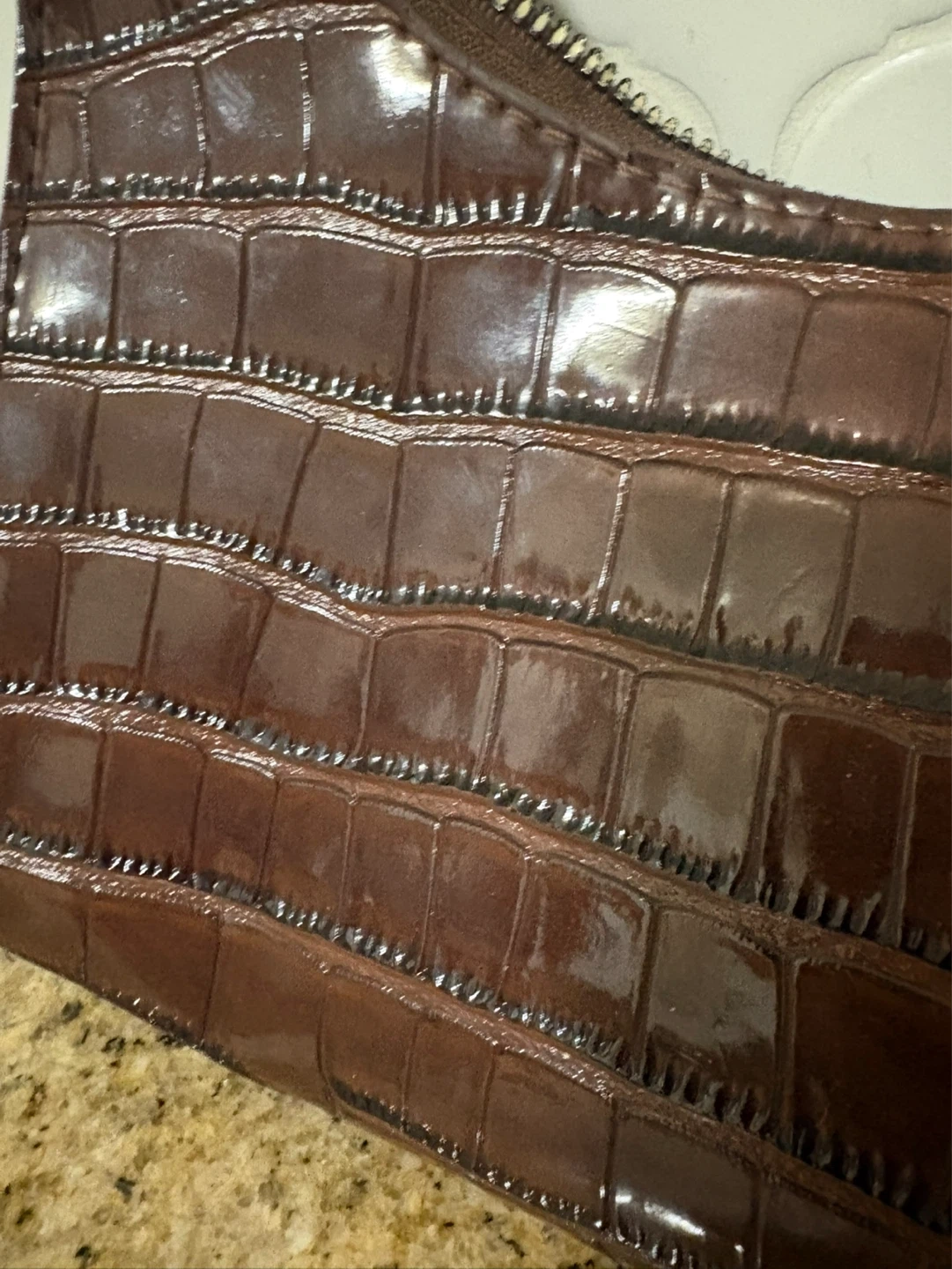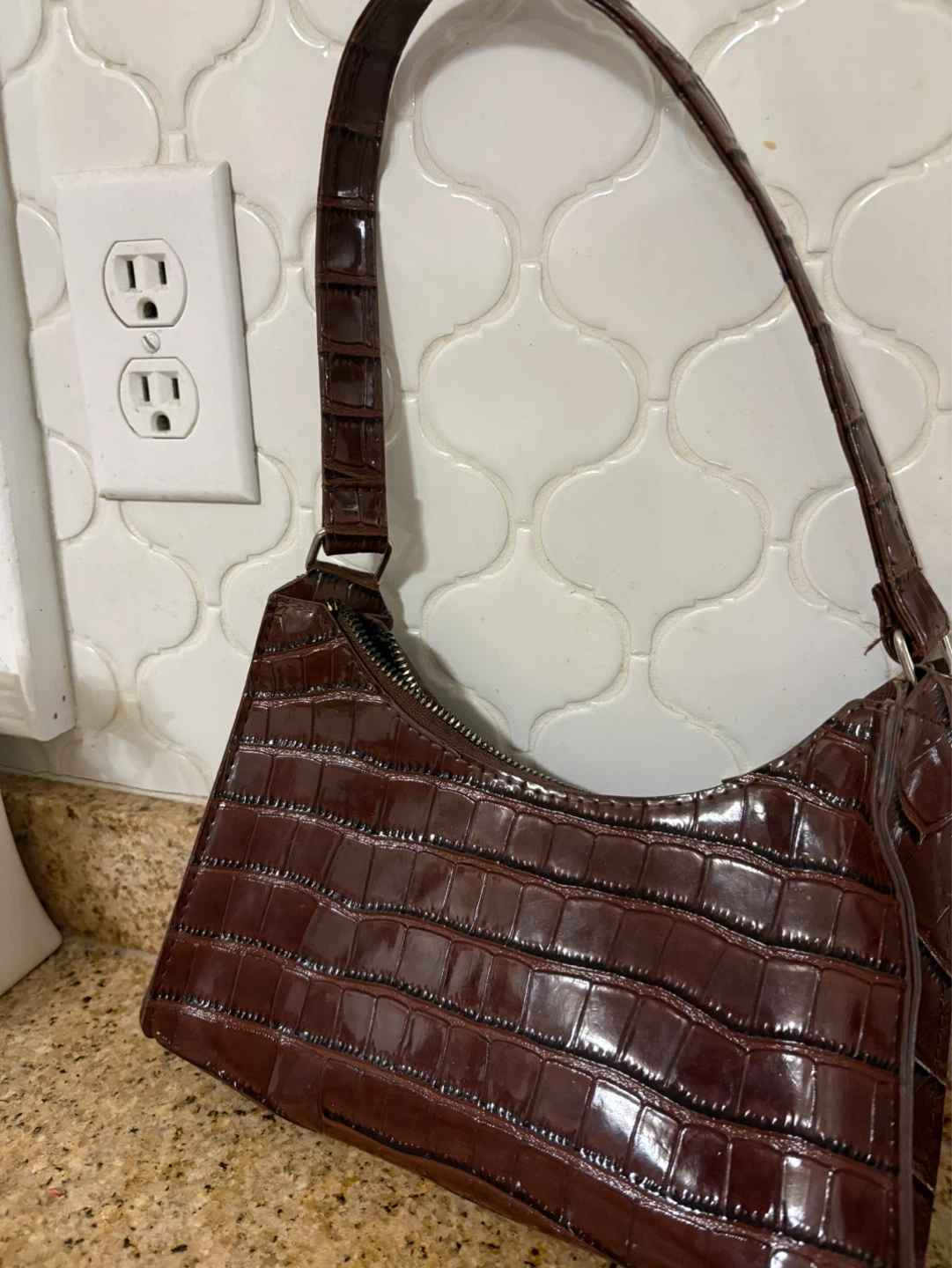 Stylish shoulder bag with a faux crocodile embossed finish. It's a dark brown colour with a zippered closure. This bag is a chic accessory for everyday wear.