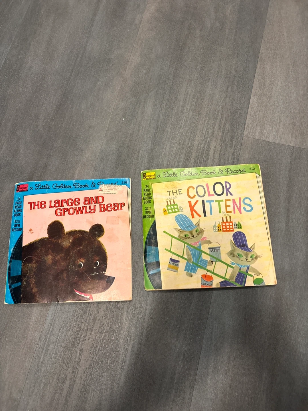 This is a set of two Little Golden Book & Record books. Includes 'The Large and Growly Bear' and 'The Color Kittens'. Both books are 24 pages and include a 33 1/3 RPM record. They have been very well loved as you can see over the years.