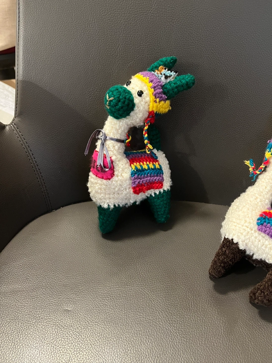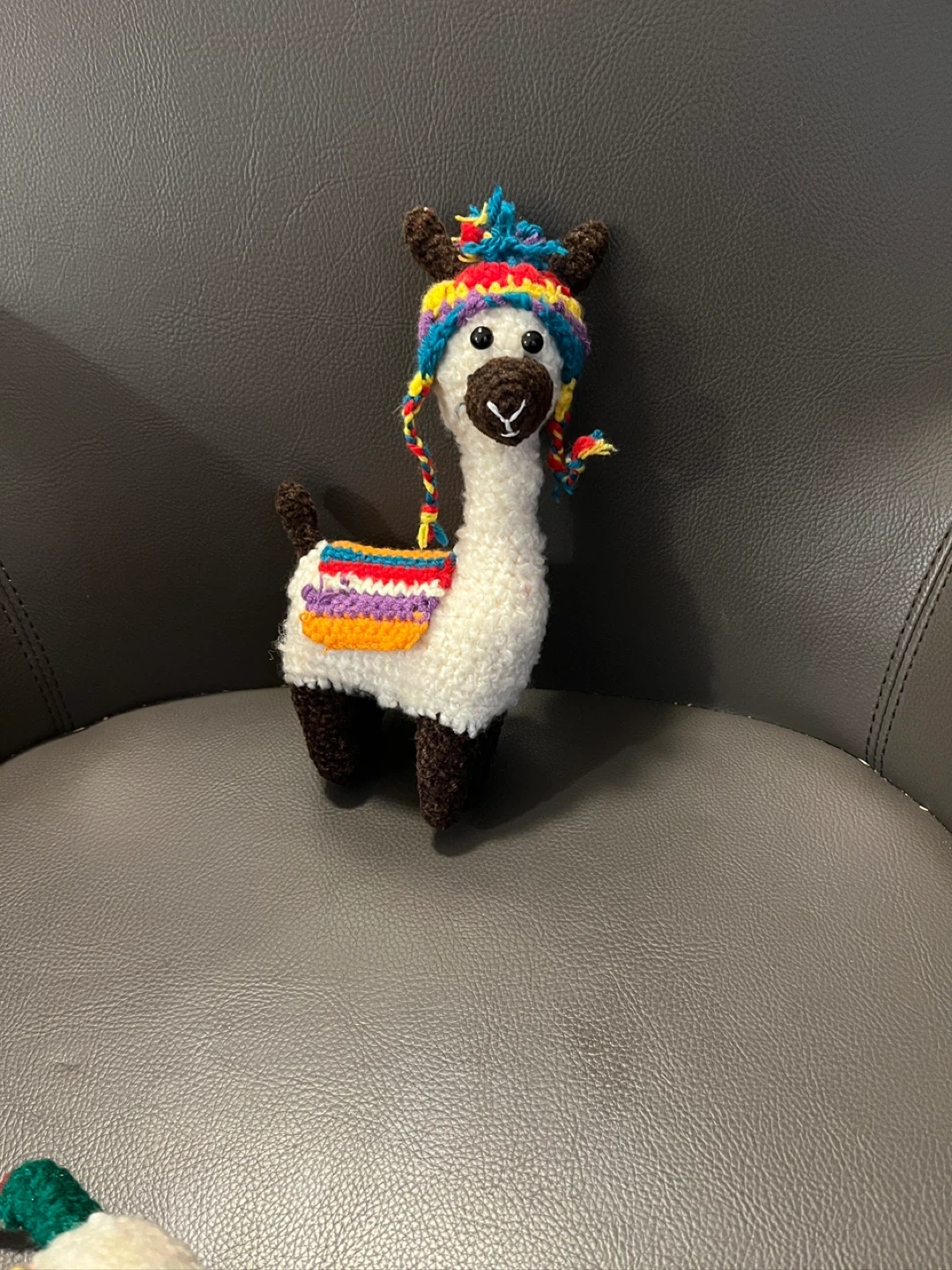 Handmade crocheted llama plush toy. It's white with colourful accents and comes with a removable blanket. This cute stuffed animal is a fun decorative piece. Perfect for adding a pop of colour to any room!