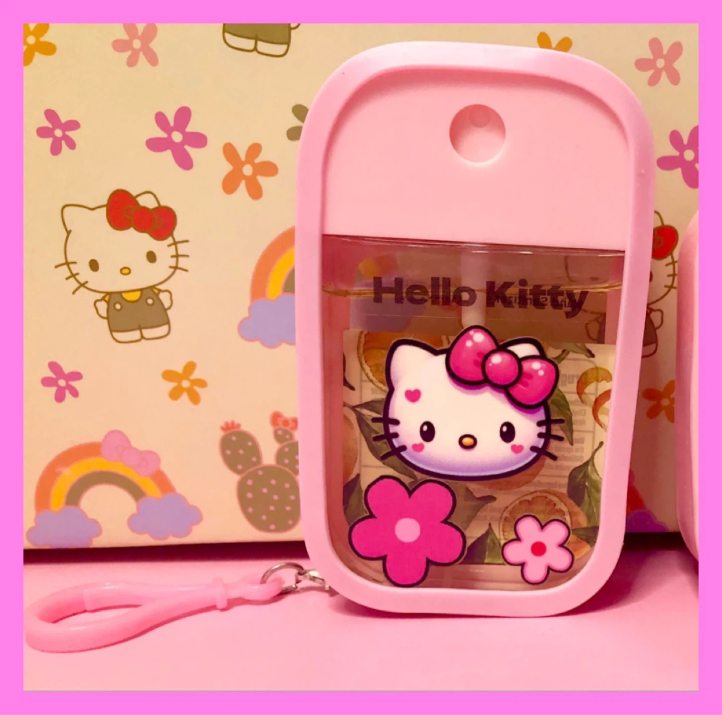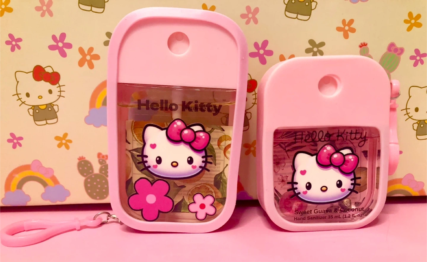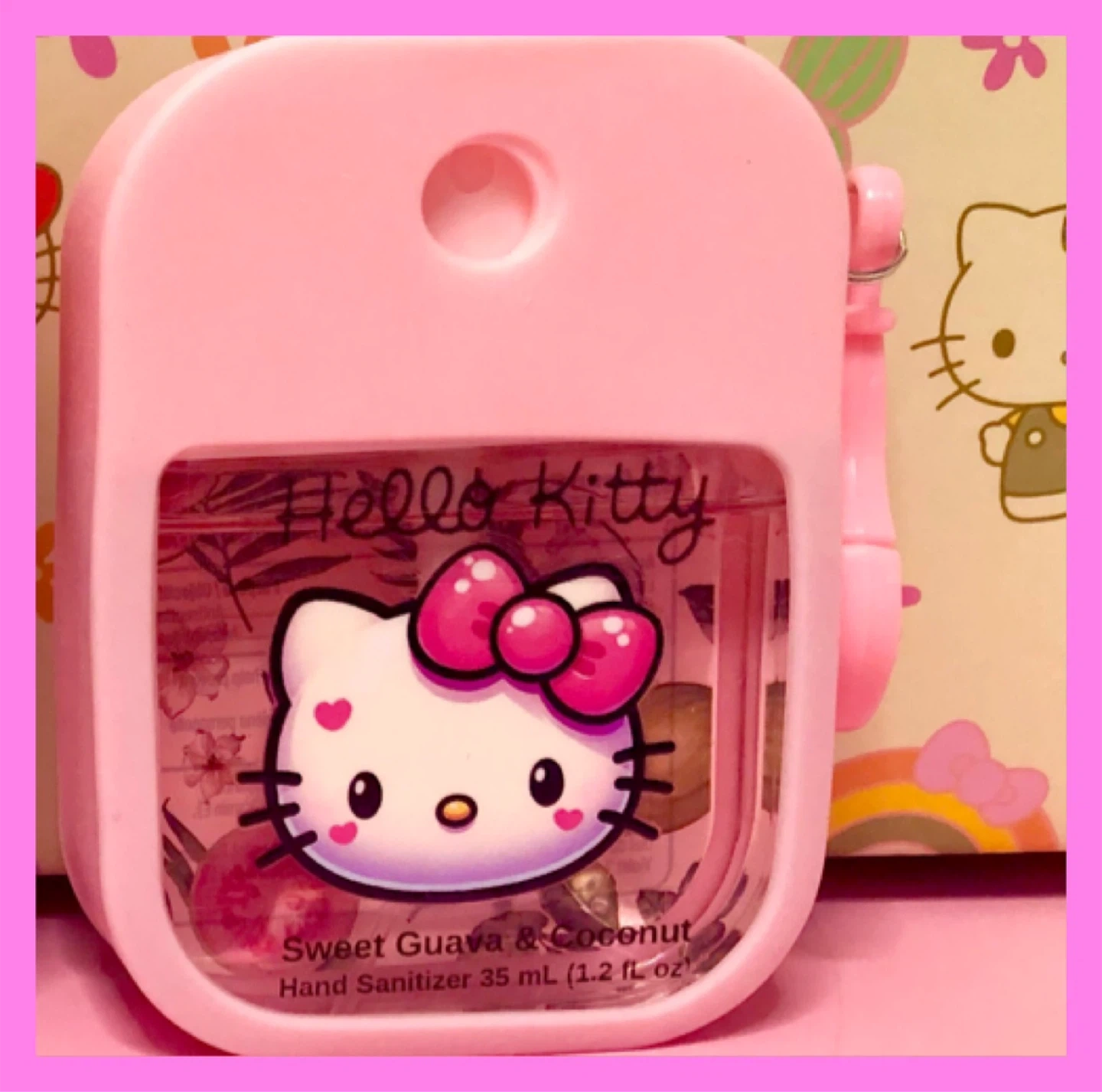 Hello Kitty hand sanitizer in a pink spray bottle. It's a Sweet Guava & Coconut scent. Includes a keychain loop for easy carrying. 35 mL (1.2 fl oz) is Sweet Guava & Coconut.