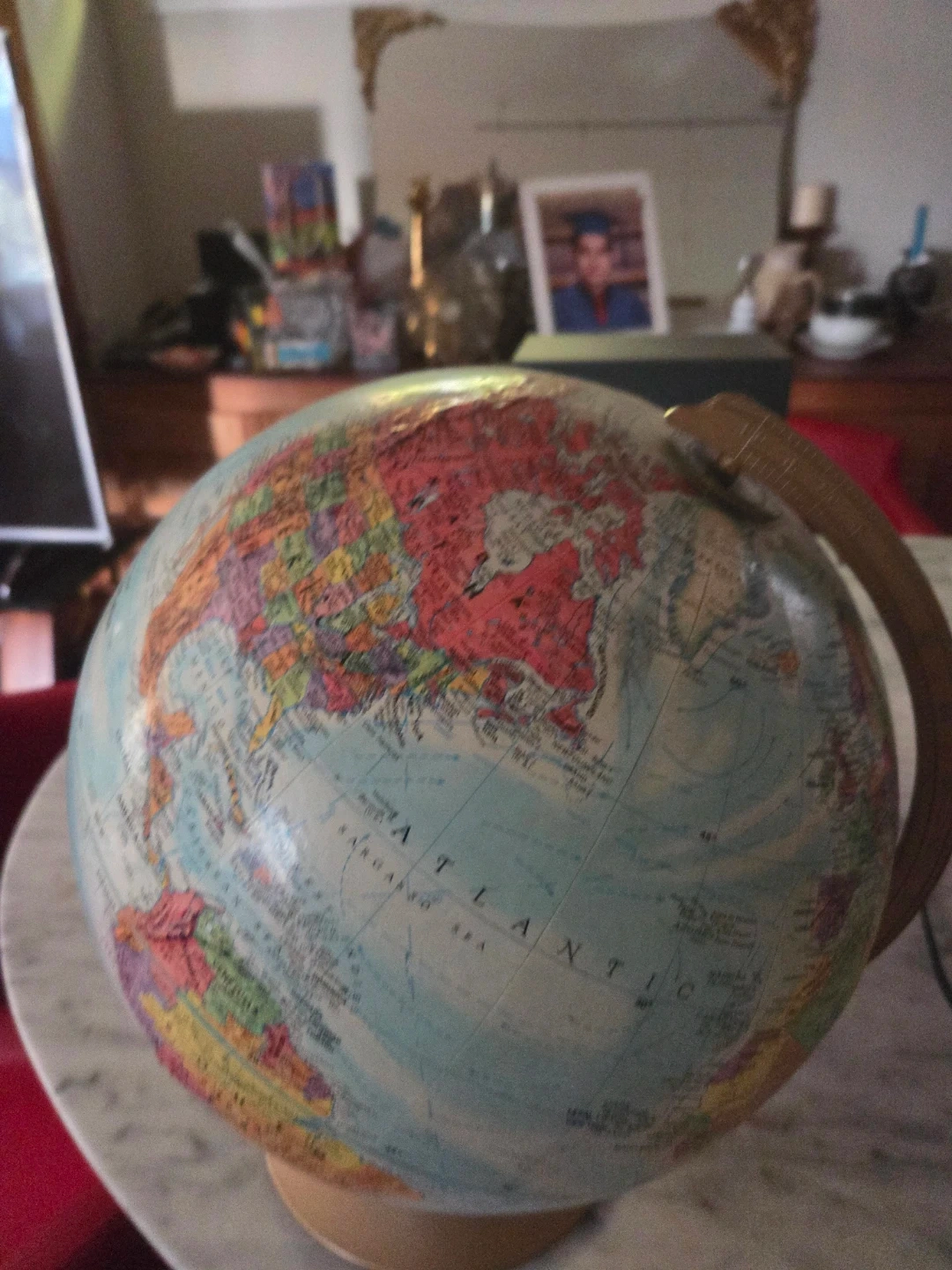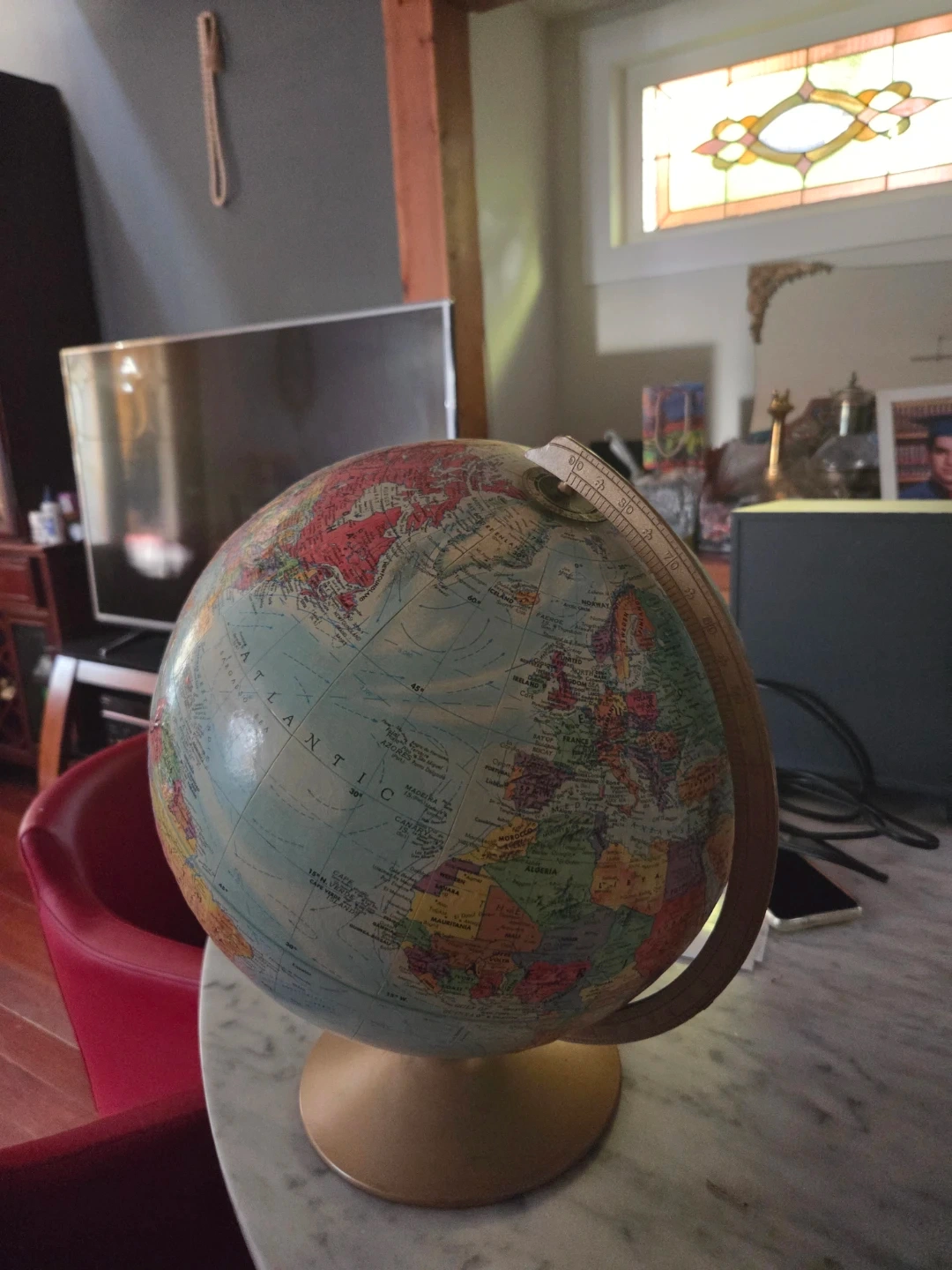 This decorative globe sits on a gold-toned stand. It displays continents, oceans, and country borders. Perfect for a study or classroom!