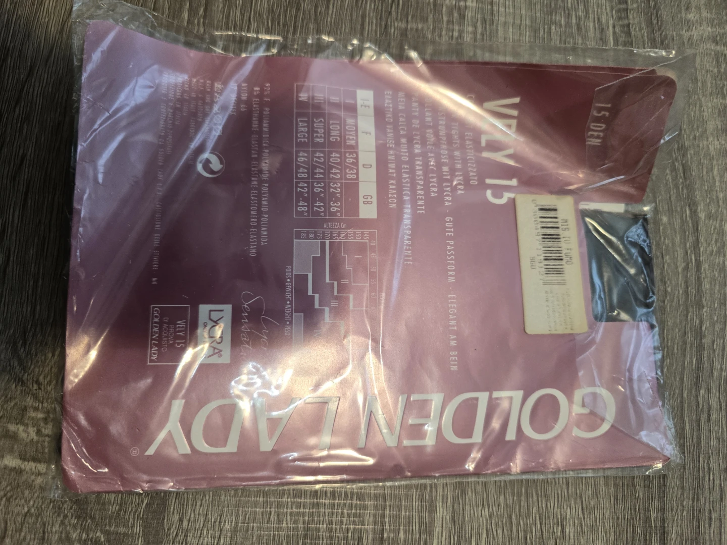 Golden Lady Vely 15 sheer tights with Lycra. They're elasticized for a comfortable fit. Available in size Large (42/44 EU, 12/14 UK, 40/42 IT).