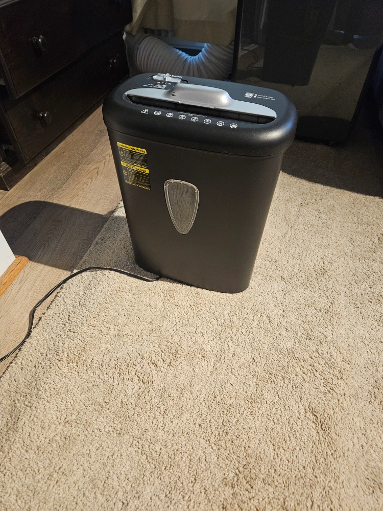 Giving away this paper shredder. It's small and great for smaller spaces. Cross-cut shredding. Eight-sheet capacity.