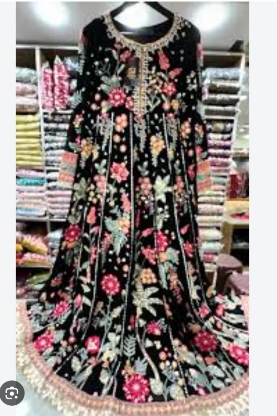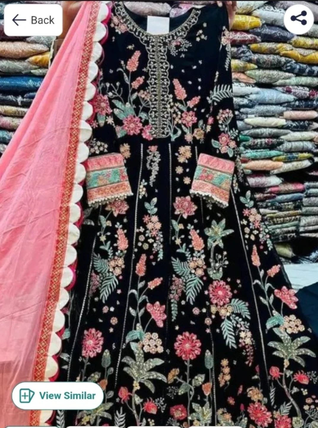Beautiful black Anarkali dress featuring vibrant floral embroidery all over. It comes with a contrasting pink dupatta with a scalloped edge. The dress has long sleeves with embroidered cuffs and a detailed neckline. Perfect for special occasions!