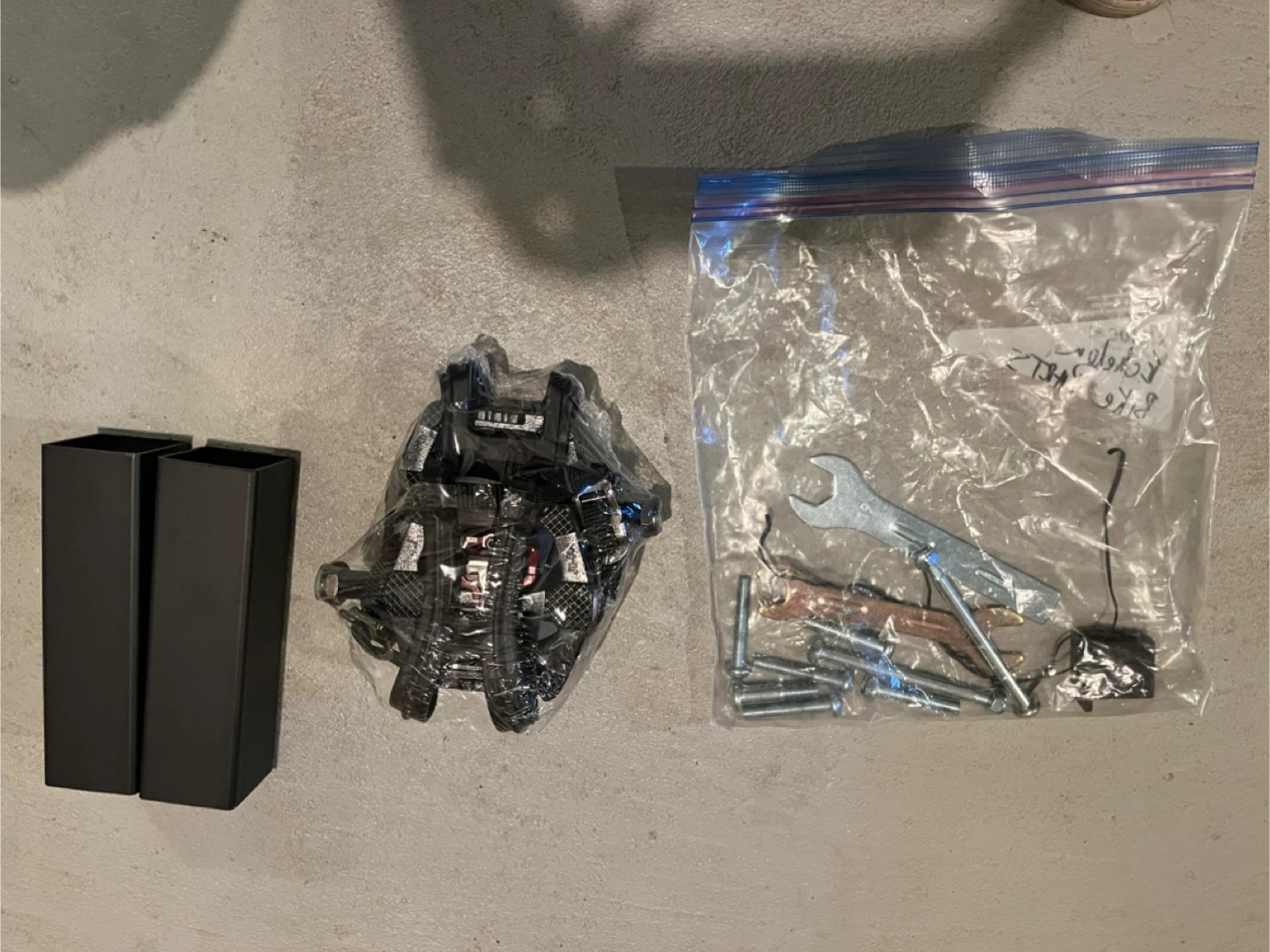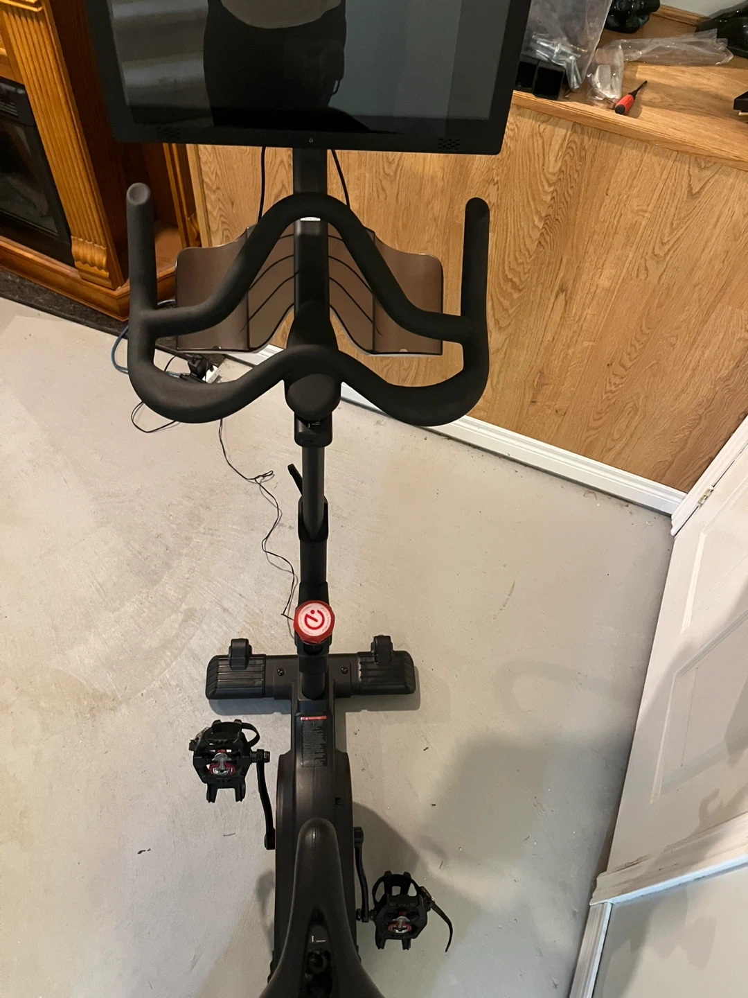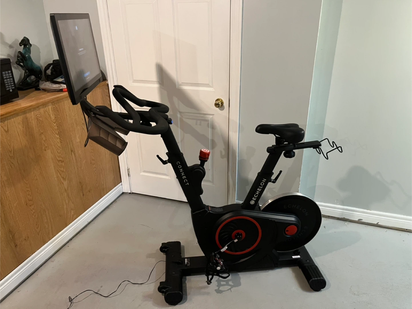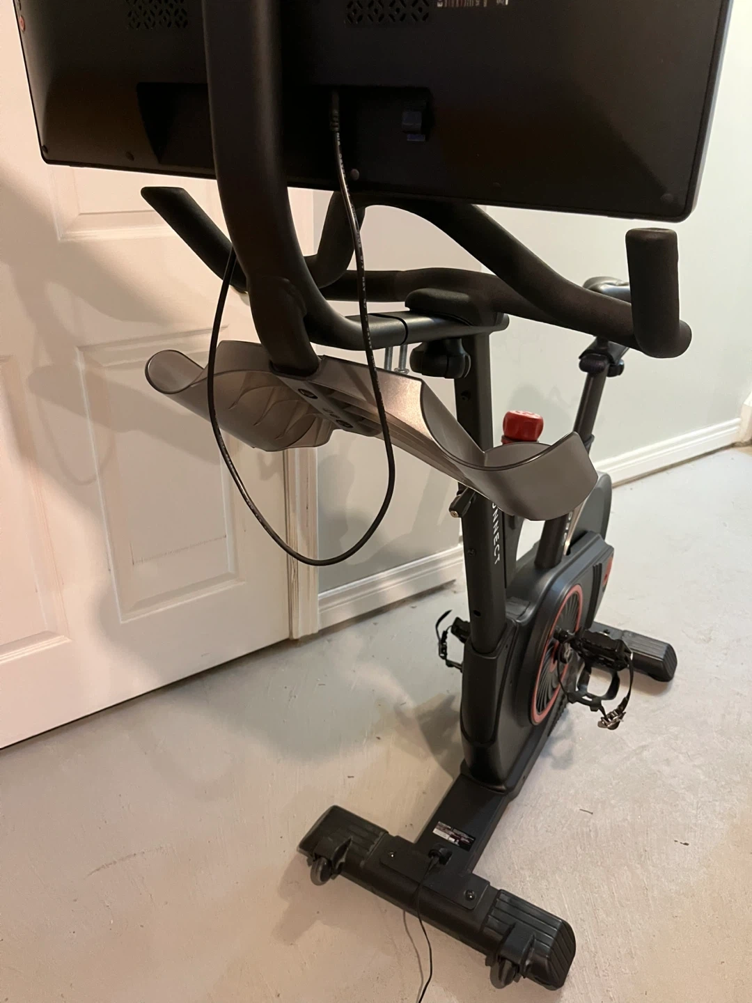 Echelon Connect indoor cycling bike with a built-in screen. This bike is black and has adjustable seat and handlebars. It's great for at-home workouts! Also comes with an additional pair of brand new pedals. Extra bolts and wrenched also included. Basically brand new.