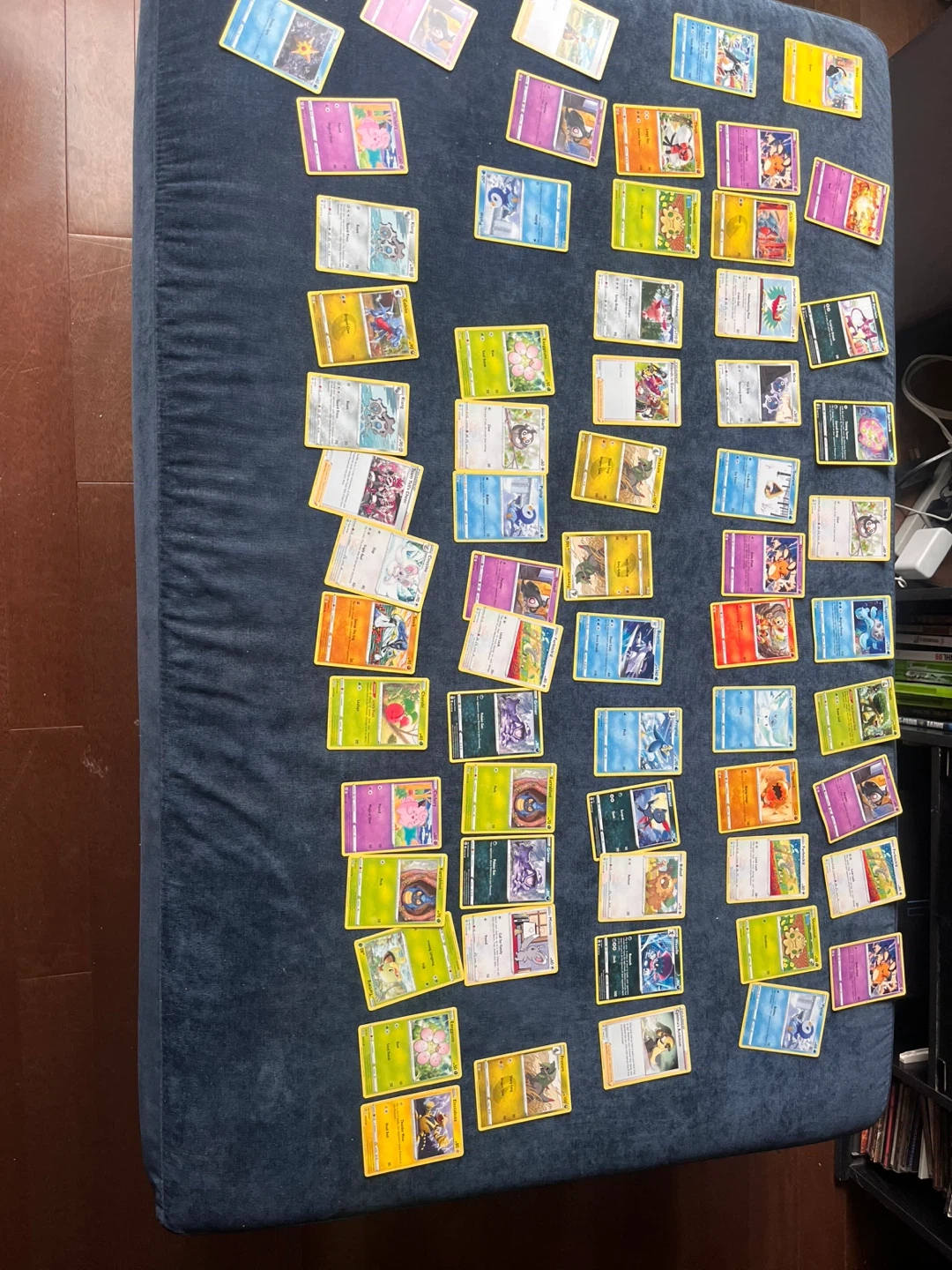 A collection of assorted Pokemon trading cards. These cards are for play and collecting. They're great for fans of the Pokemon universe. Perfect for adding to your collection or starting a new one! Over 100 found them in a storage locker. There all new great condition