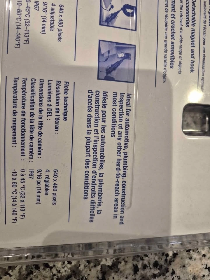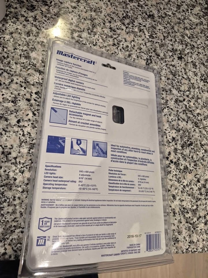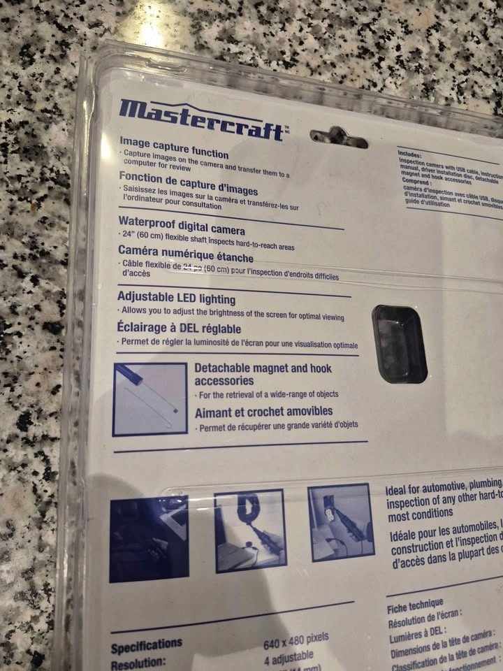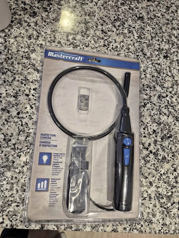 This is a Mastercraft Basic Inspection Camera. Ideal for examining hard-to-reach areas in automotive, plumbing, and construction tasks. Features a waterproof camera head and flexible cable for navigating damp spaces. Includes a USB computer interface to capture images and transfer them to a computer for review. Equipped with 4 adjustable LED lights for brightness control. **NEVER USED** Located near the south end GO station.