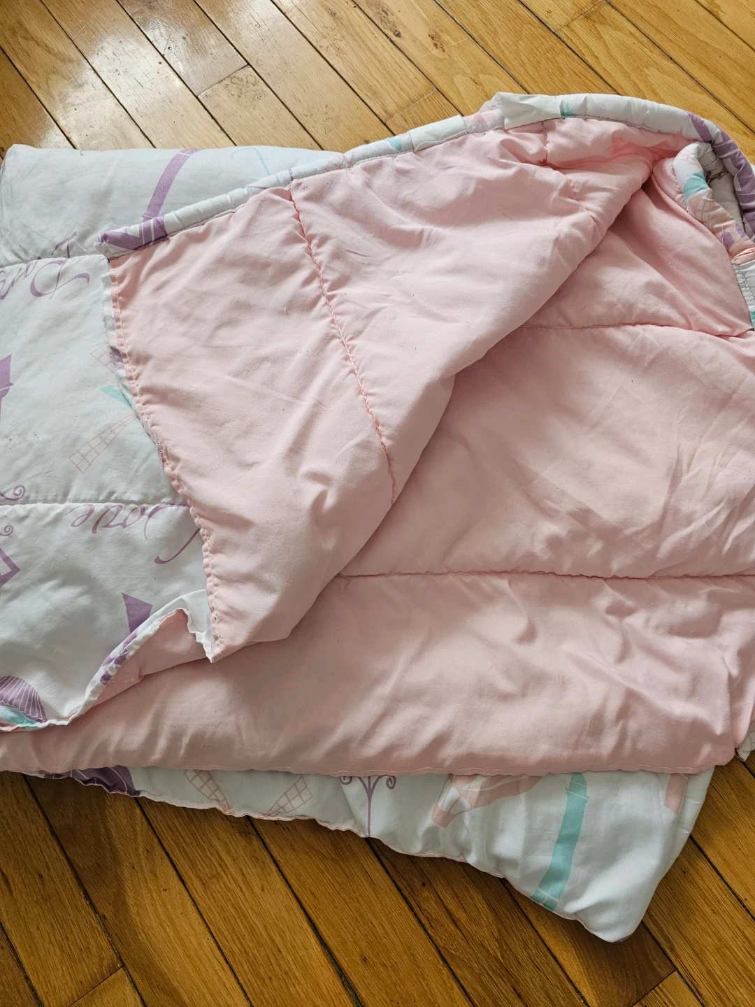 This kids comforter for twin bed features a charming pink Eiffel Tower and hot air balloon design. It's perfect for sleepovers or camping trips. Made with a soft lining for comfort.