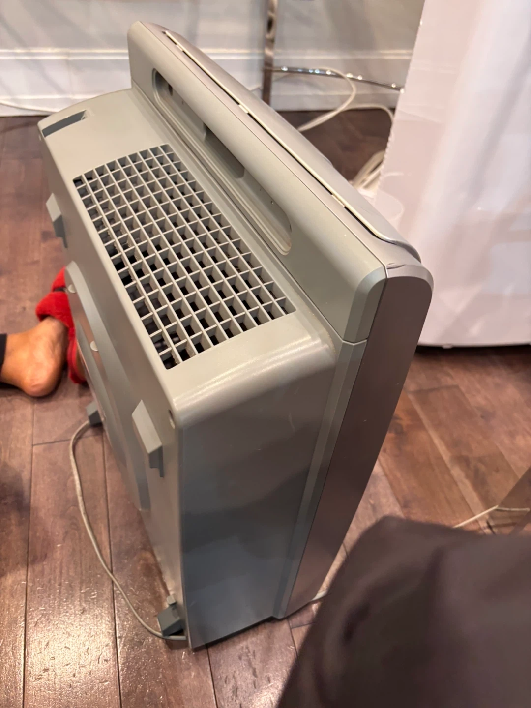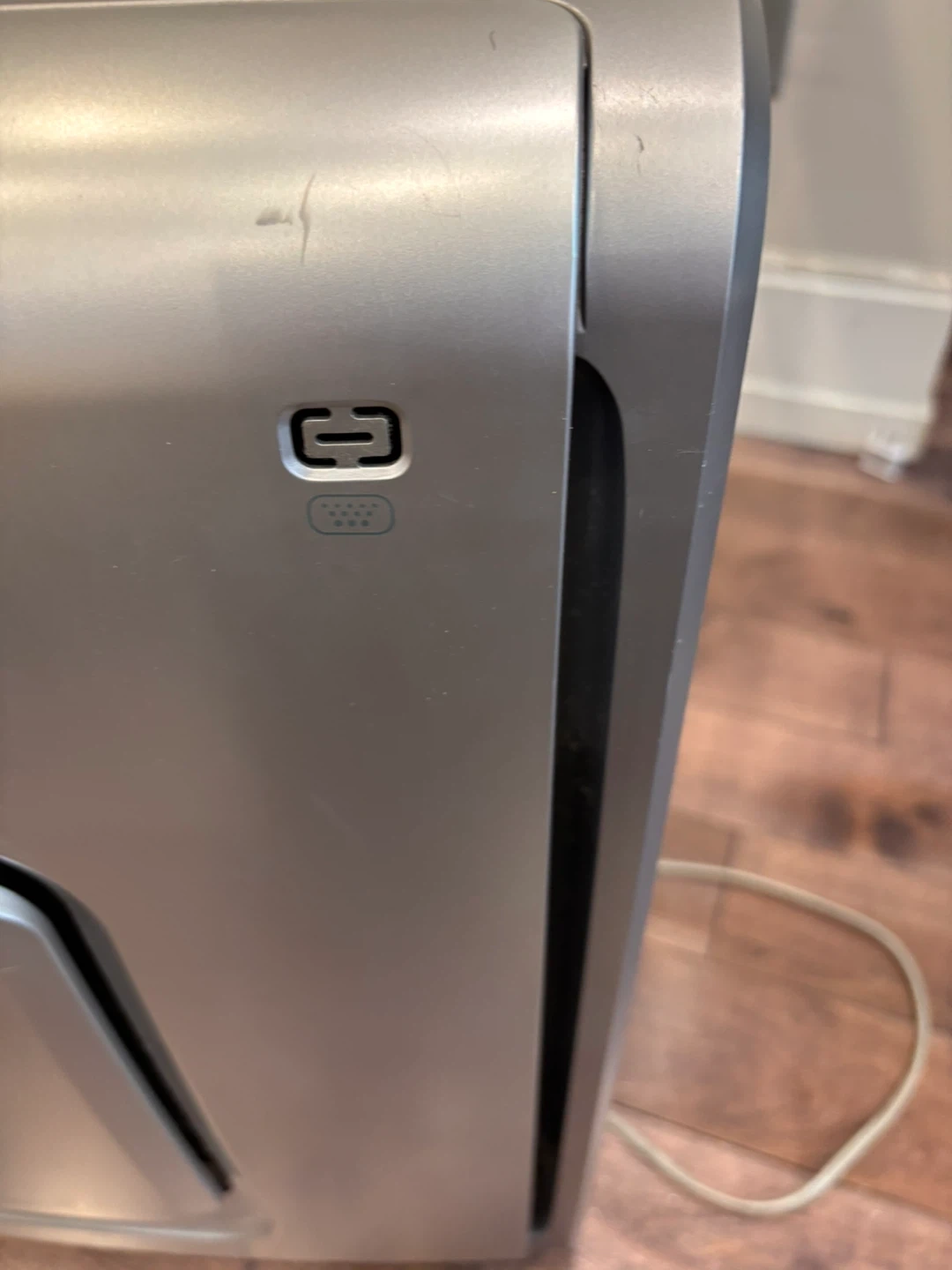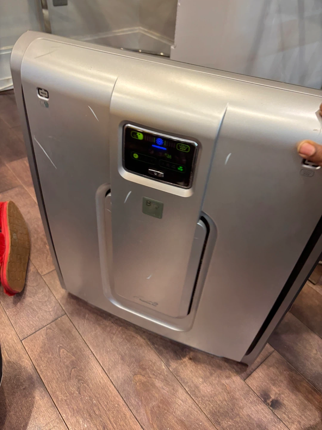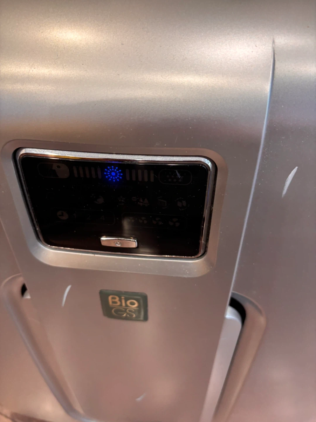 Sharp air purifier with Bio GS technology. This unit is silver and has a digital display for settings. It features Plasmacluster Ion technology to clean the air.