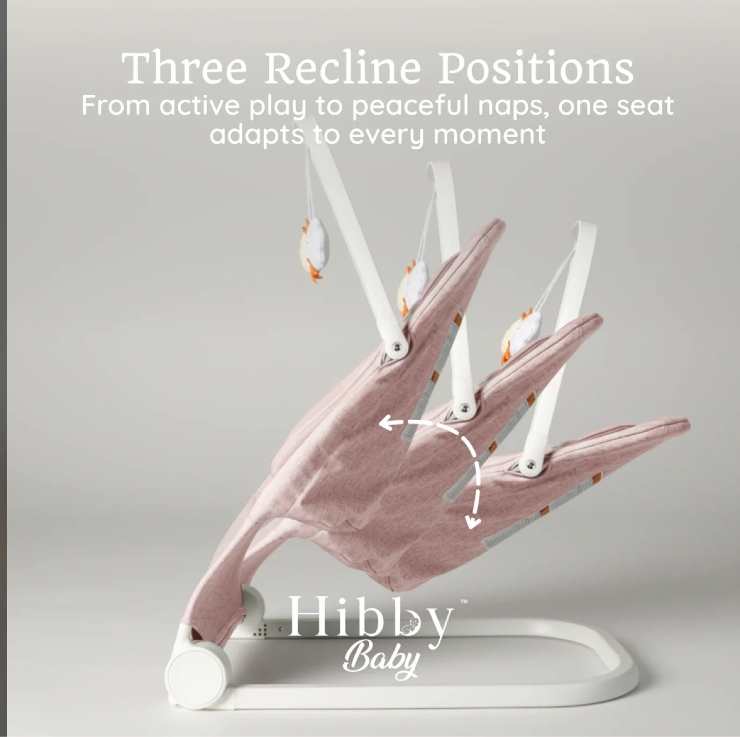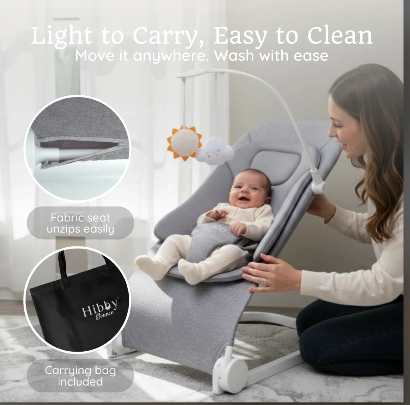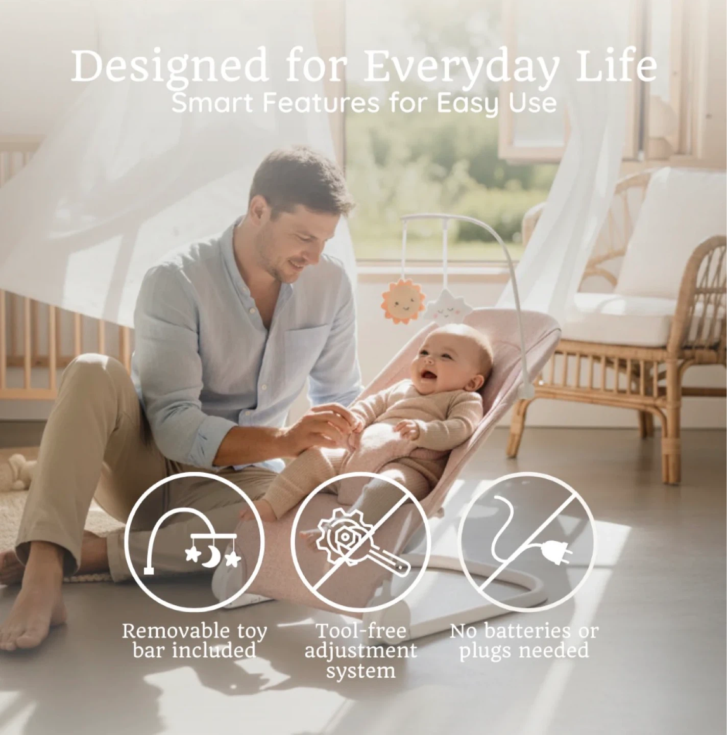 Designed for everyday life, this baby bouncer offers three recline positions for active play and peaceful naps. It's lightweight to carry and easy to clean with a fabric seat that unzips. Includes a removable toy bar, a cushioned newborn insert, and a carrying bag.