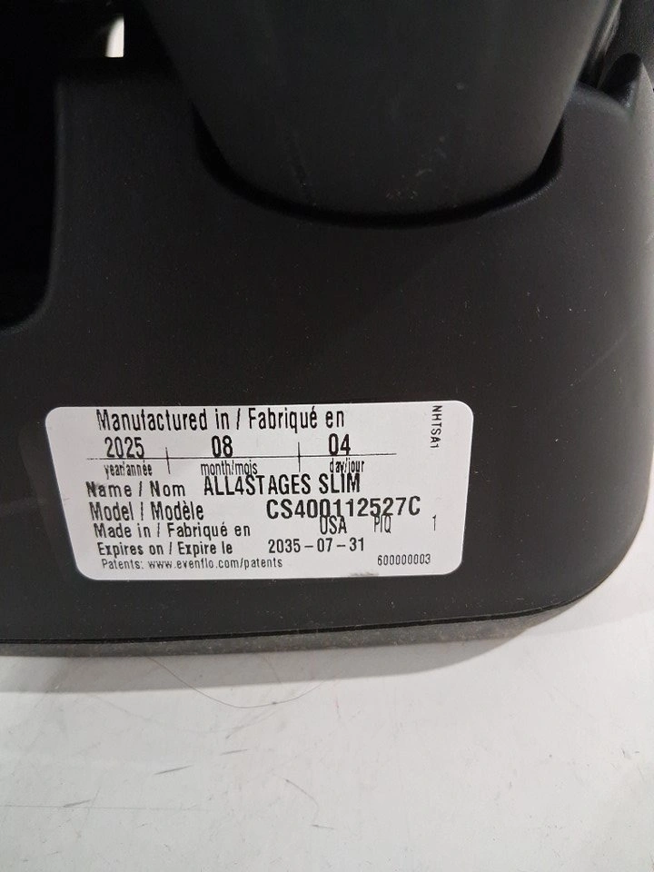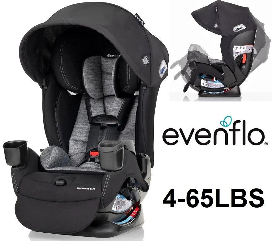BRAND NEW! Never used. This Evenflo All4Stages Slim+ convertible car seat grows with your child from newborn to booster, up to 10 years of use. It's a space-saving design that fits easily in most vehicles and can even allow for 3 car seats across.