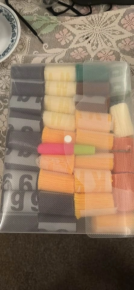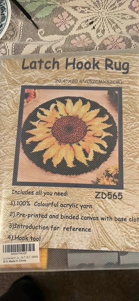 Complete latch hook rug kit. Make a super cute sunflower rug. It's 20.4 by 20.4 inches. Comes with everything: colorful acrylic yarn, pre-printed canvas, instructions, and the hook tool. Still sealed up!