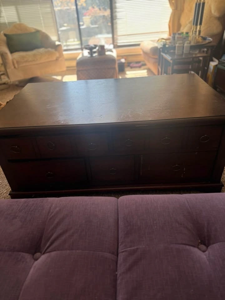 Solid wood coffee table with multiple drawers. 47.5” long, 27” wide, 19” high. Unit is solid wood so quite heavy. Must pick up in Port Coquitlam.