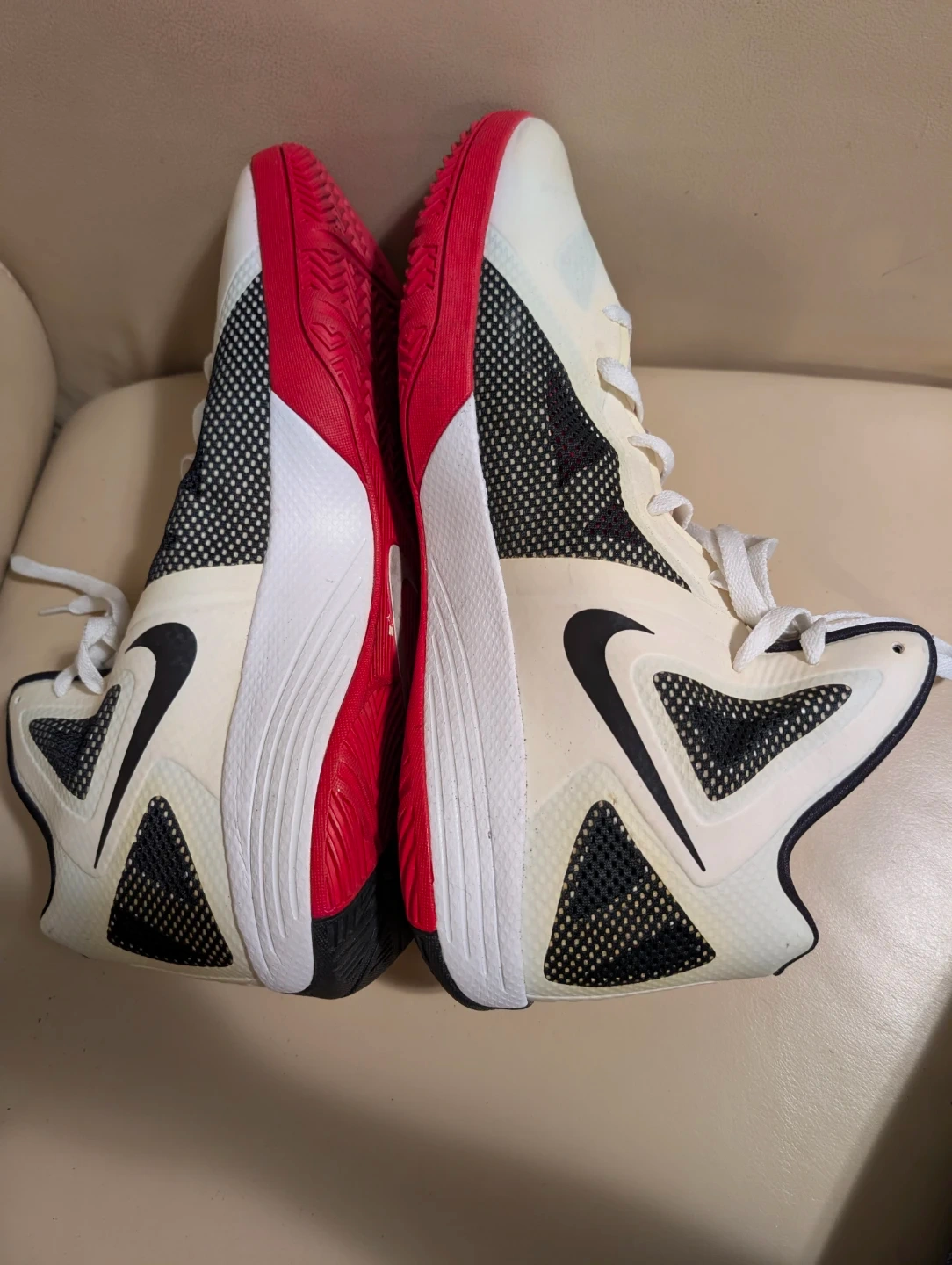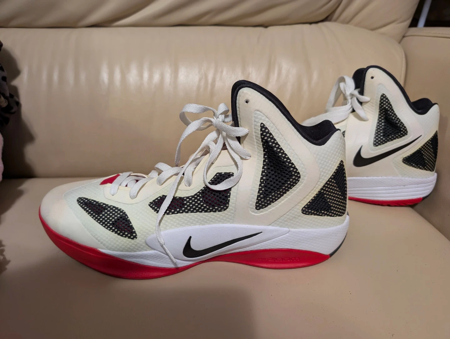 Nike basketball shoes with a Zoom Hyperfuse design. Features white, black, and red accents. Lace-up closure. Suitable for athletic performance.