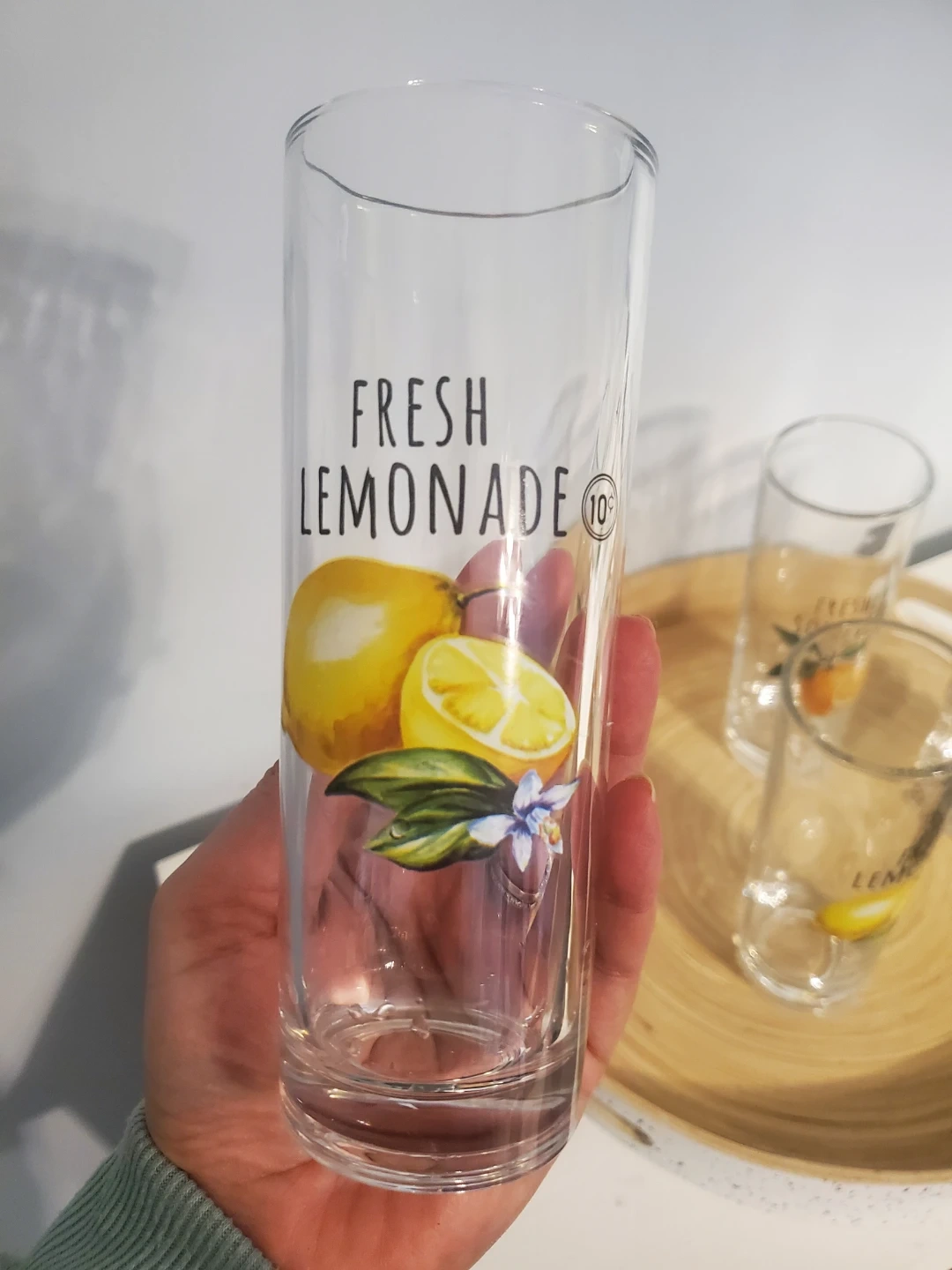 Four tall clear tumblers with "Fresh Lemonade" and "Freshly Squeezed" text graphics. Each glass features watercolour-style illustrations of lemons and oranges. Dishwasher safe for easy cleanup!