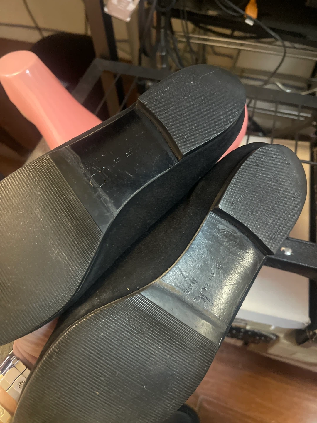 Comfortable black suede loafers featuring a braided gold embellishment across the vamp. These slip-on shoes offer a classic silhouette. Material appears to be suede with a synthetic sole.