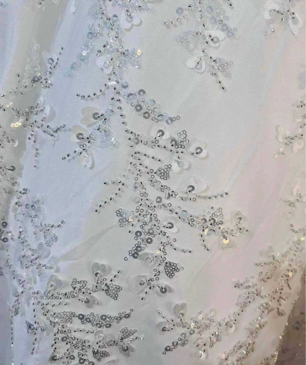 Beautiful beaded wedding dress with a sweetheart neckline and a long flowing skirt. Perfect for a bride who wants to feel glamorous and elegant on her special day. It is free size as the back is open.