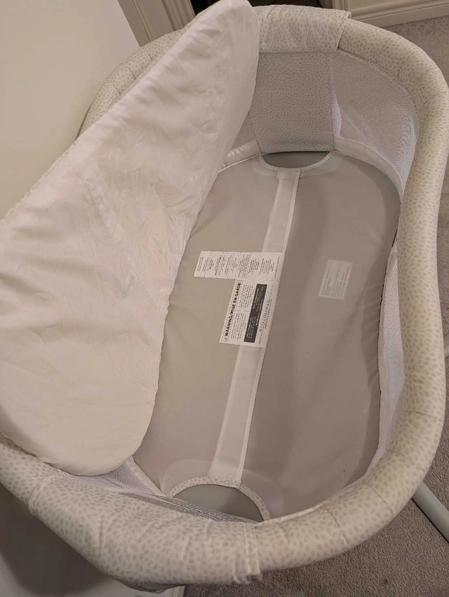 Used Halo Bassinest Premiere Swivel Sleeper with 2 fitted sheets. This bassinet is designed to bring your baby close, even right next to you in bed, which is great for the first few months. The condition is good with all functions working. From a smoke-free and pet-free home. Key features include: 360° swivel, soothing sounds and vibrations, adjustable height, and breathable mesh walls. If the ad is up, the sleeper is available.