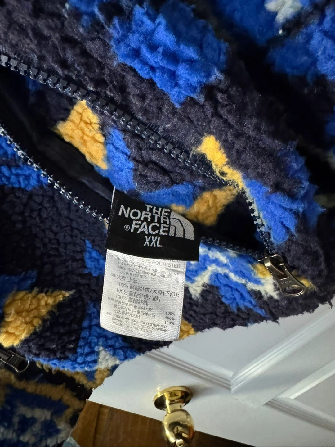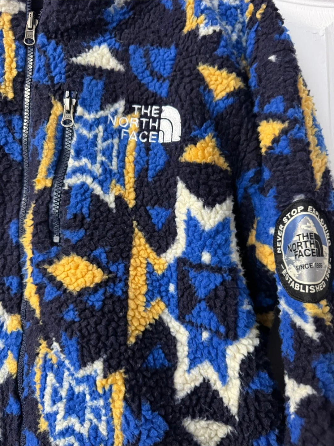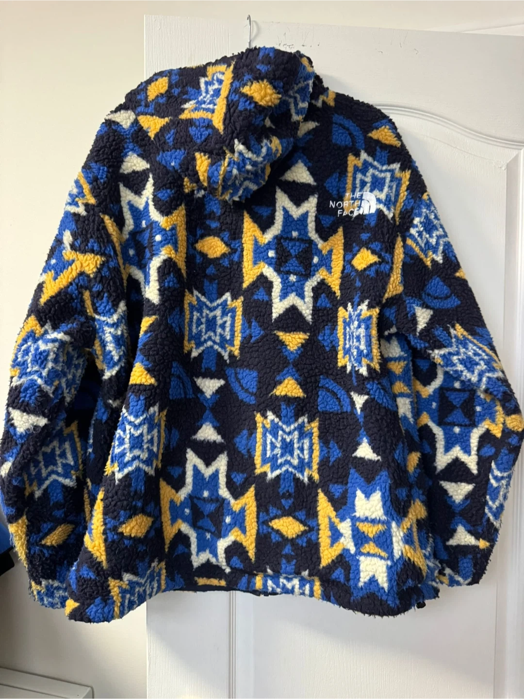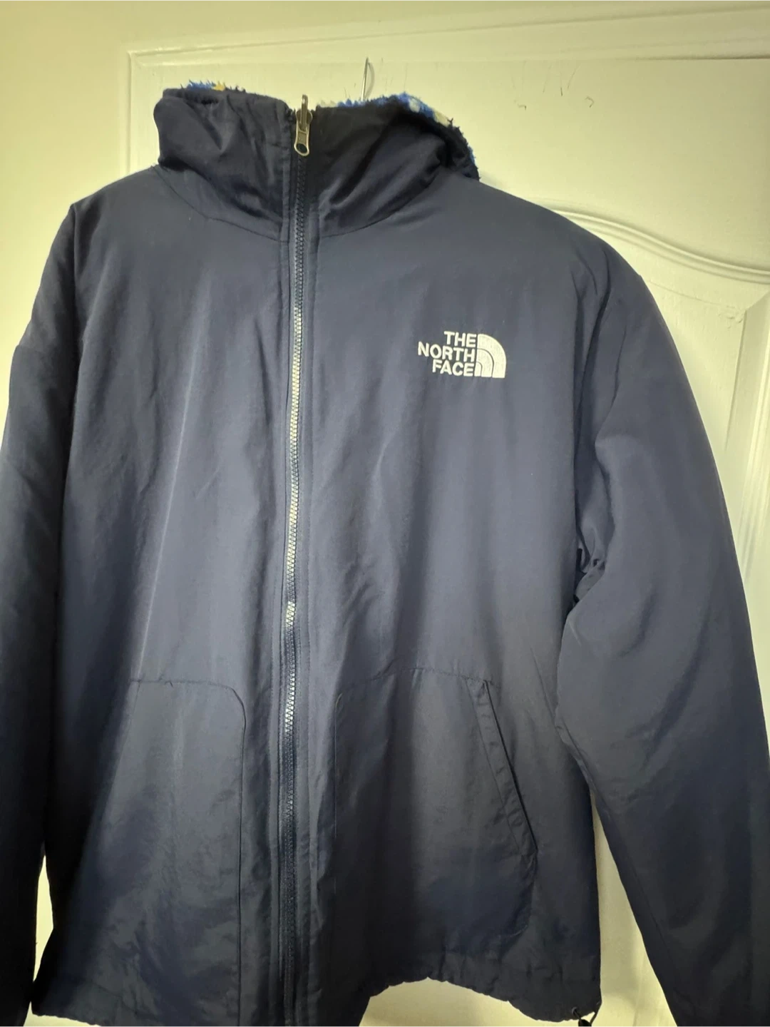 This reversible jacket from The North Face features a cozy fleece interior with a colourful pattern and a smooth navy blue exterior. It's designed for warmth and versatility. Perfect for chilly days outdoors! XXL